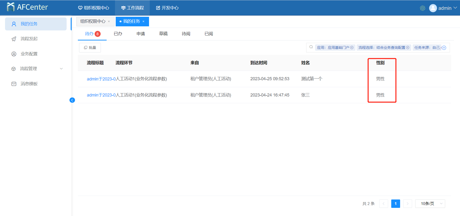 使用场景:人员信息录入审批流程发起后,在工作流程=》我的任务中根据当前审批流程表单中的性别业务字段查询性别为男的已办任务列表。