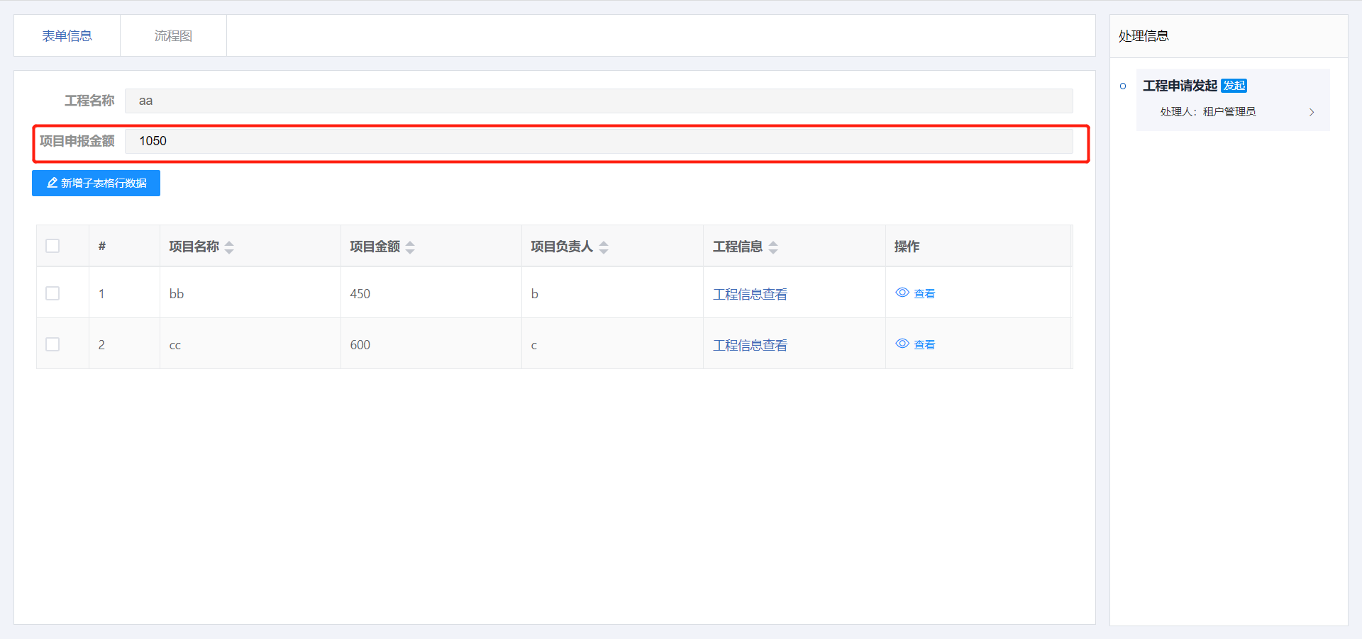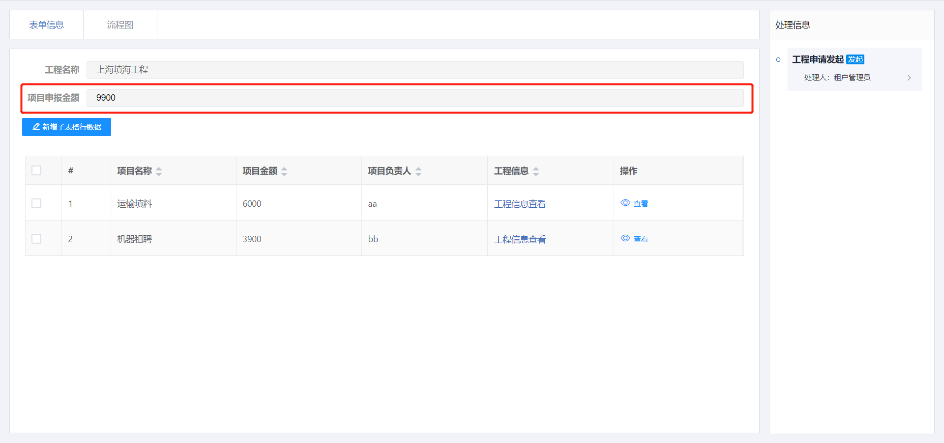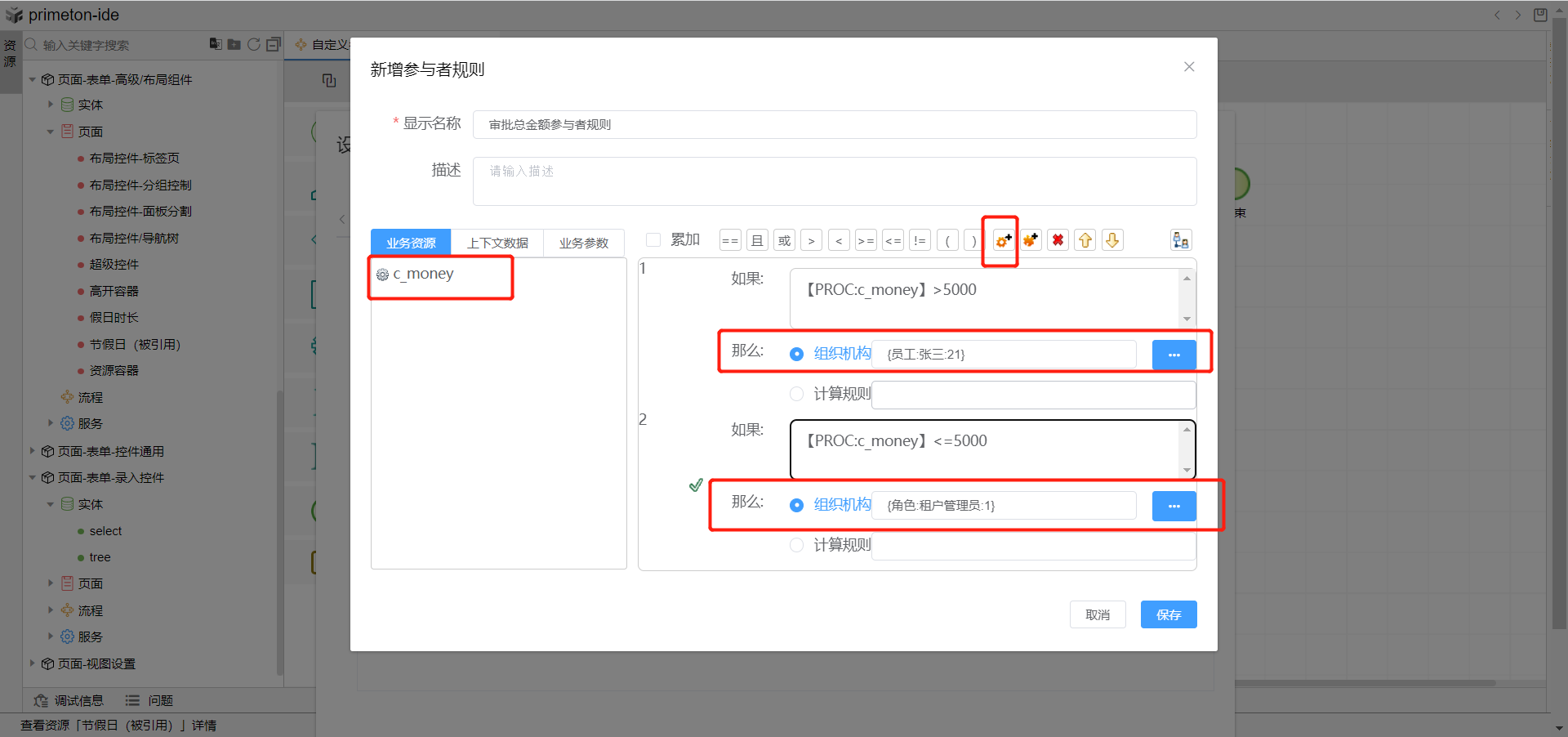 使用自定义参与者规则功能,在工程申请表单填写金额大于5000时交由具体人员张三审批,工程审批金额小于等于5000时交由租户管理员角色审批。