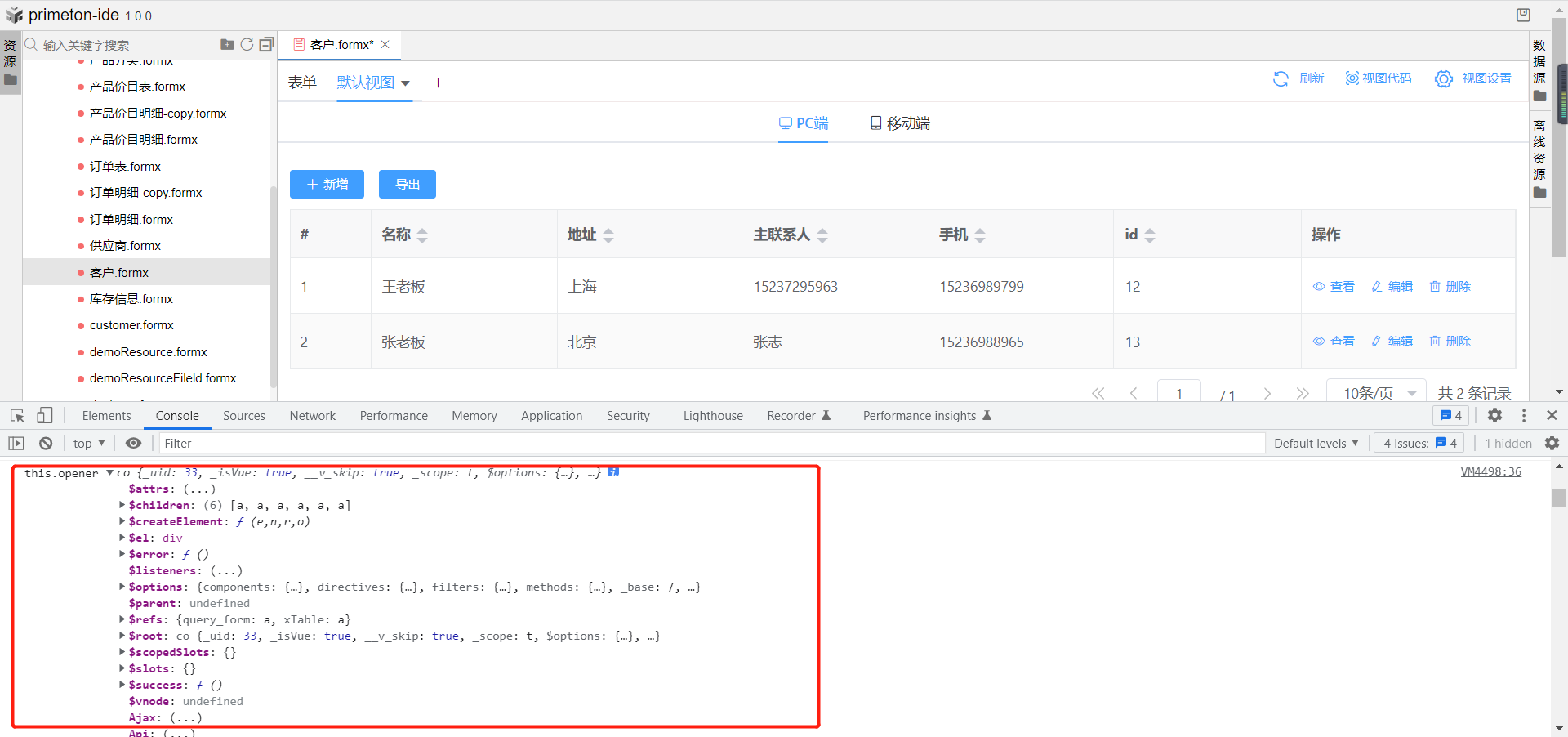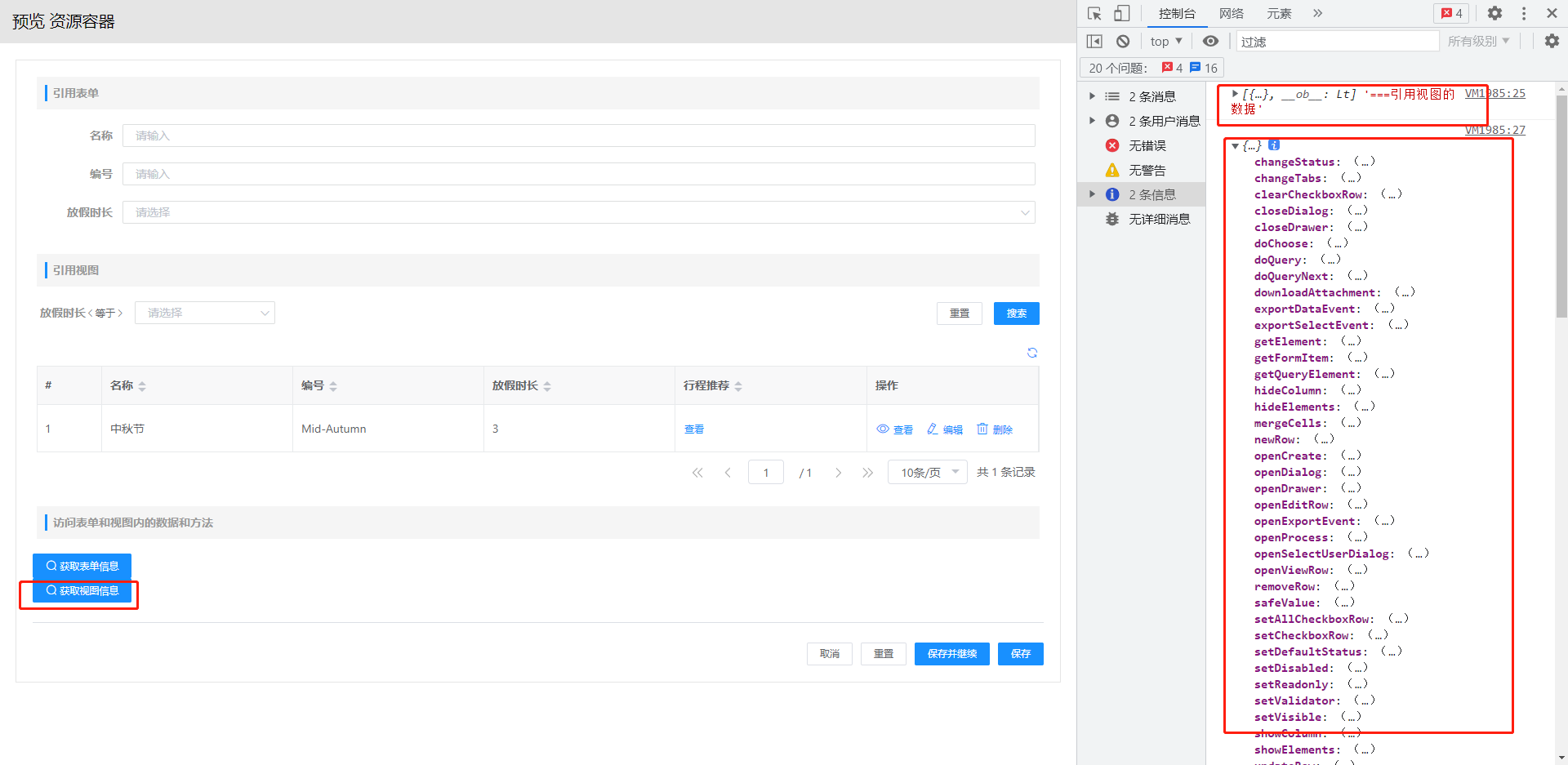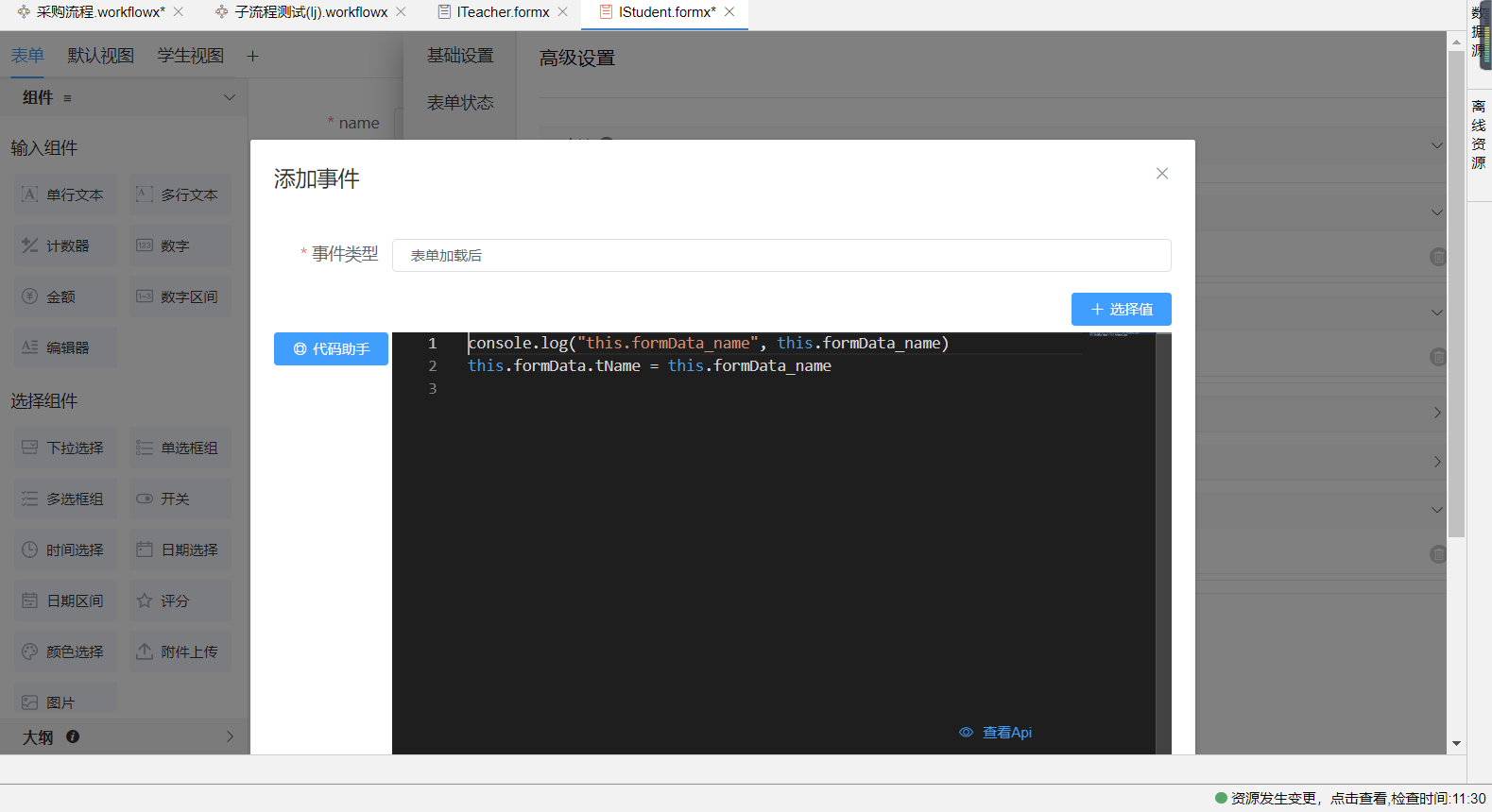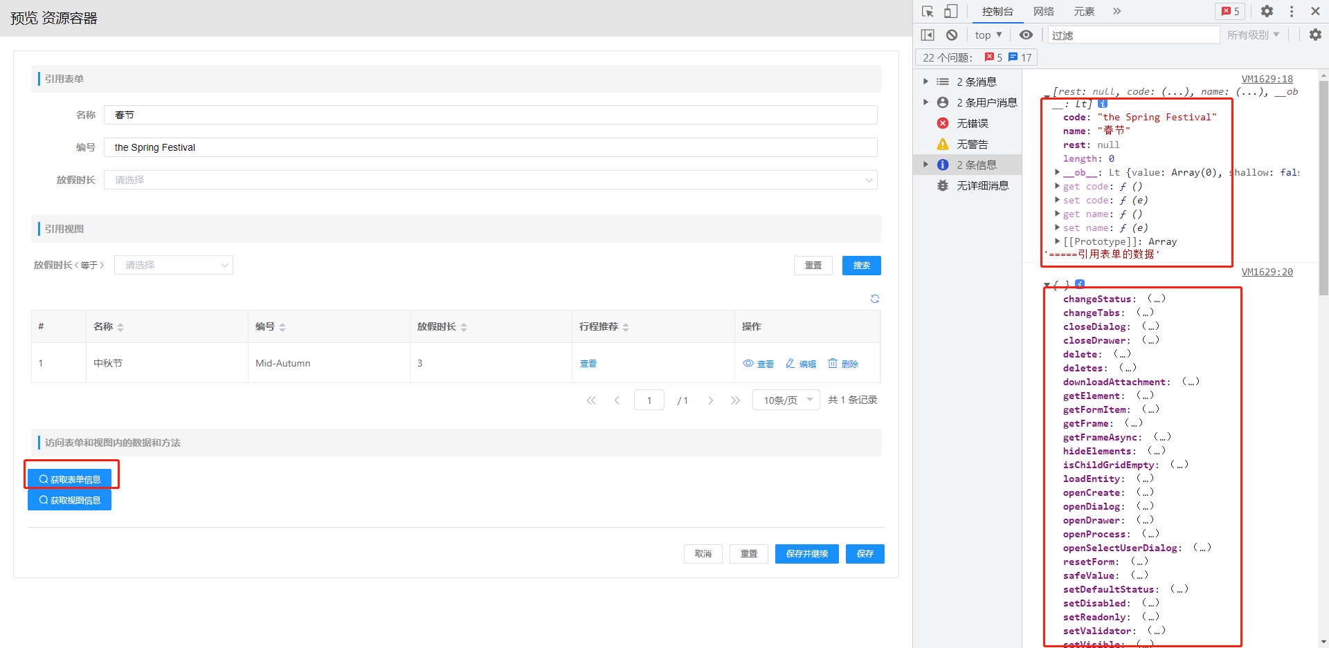 例如在Iteacher的表单中放入绑定IStudent的子表格组件,在IStudent的视图中就可通过this.parentFormData拿到作为父表单的ITeacher表单中formData的数据。如下图所示,在子表格行操作按钮中写下触发事件在控制台打印this.parentFormData参数,即可看到ITeacher的formData数据展示在控制台中。