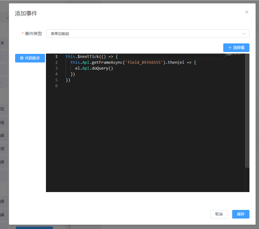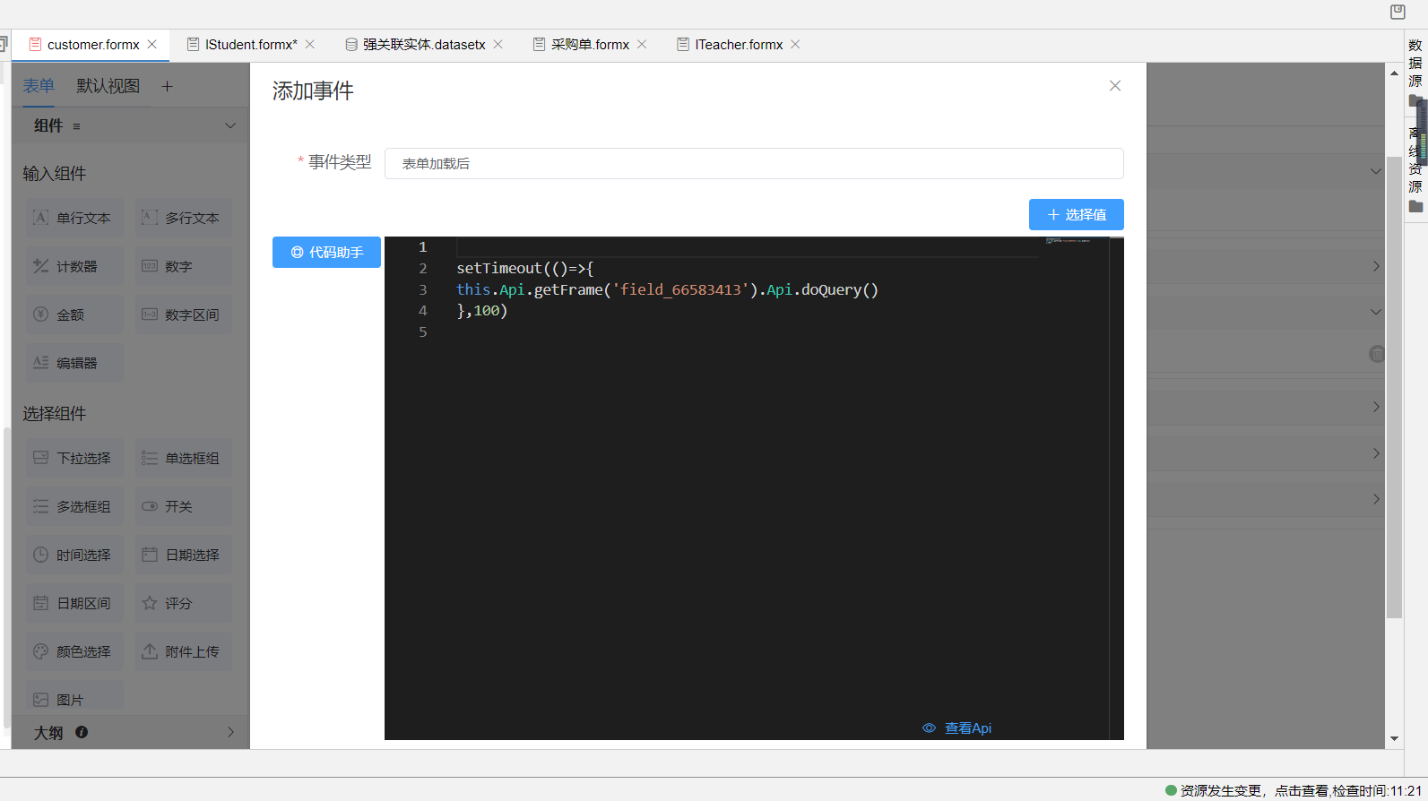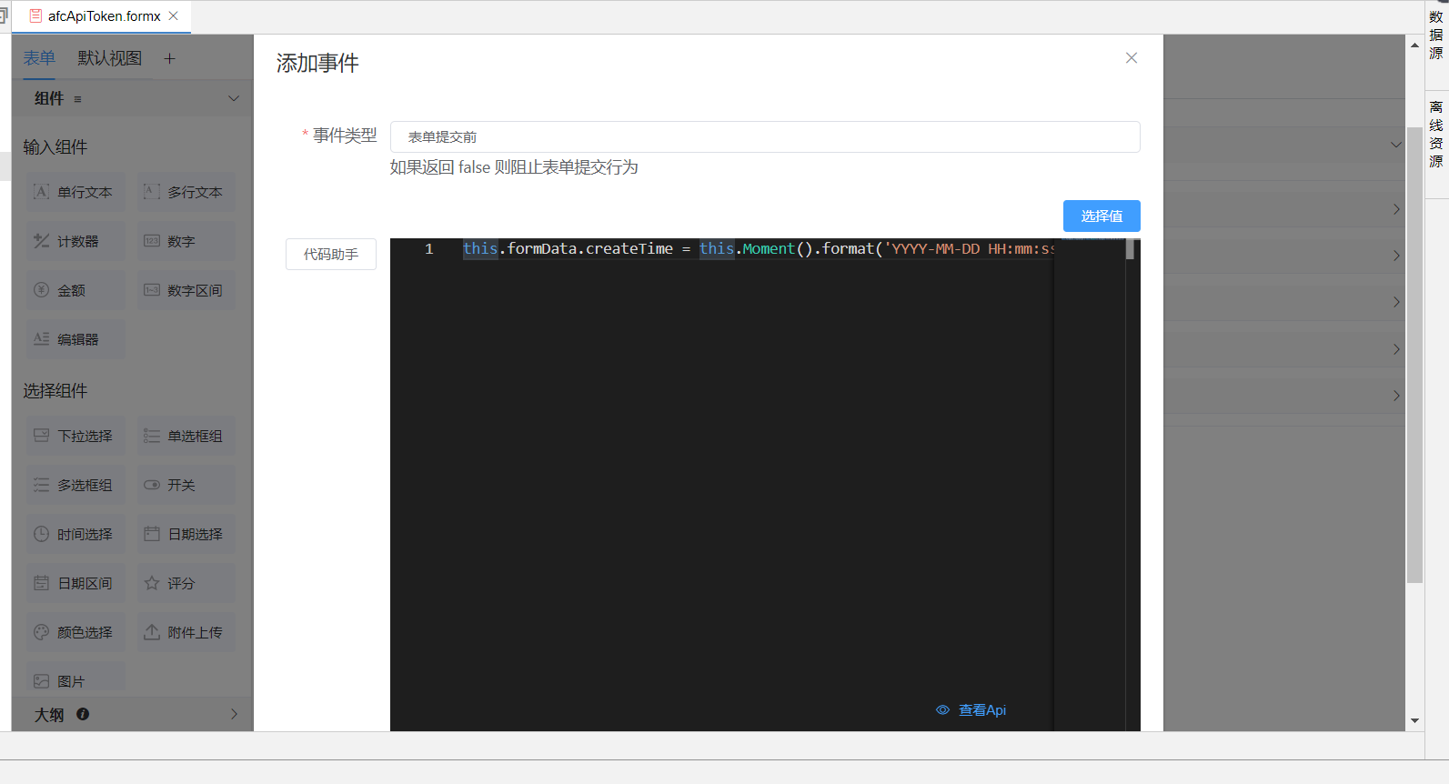 也可在表单的js事件中使用API为选择组件设置options值,如下: