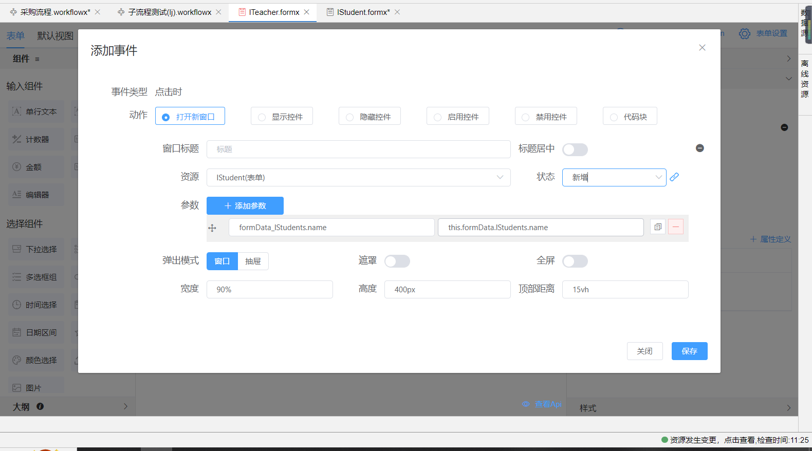 上图为代码块打开弹窗传参,也可使用配置化打开弹窗。