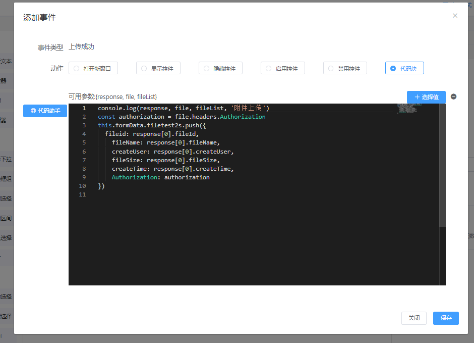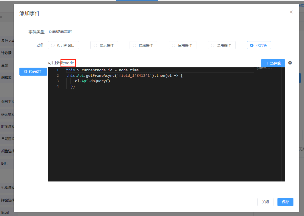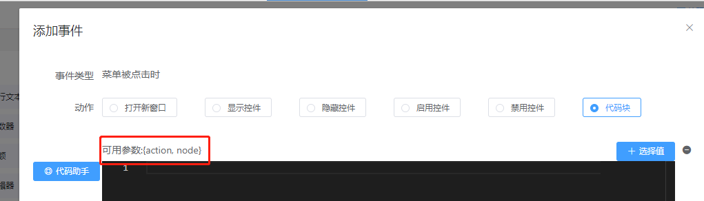 步骤2. 在高级里添加事件(菜单被点击时),选择代码块,可以获取到当前点击节点的数据action(菜单的action类型)和node