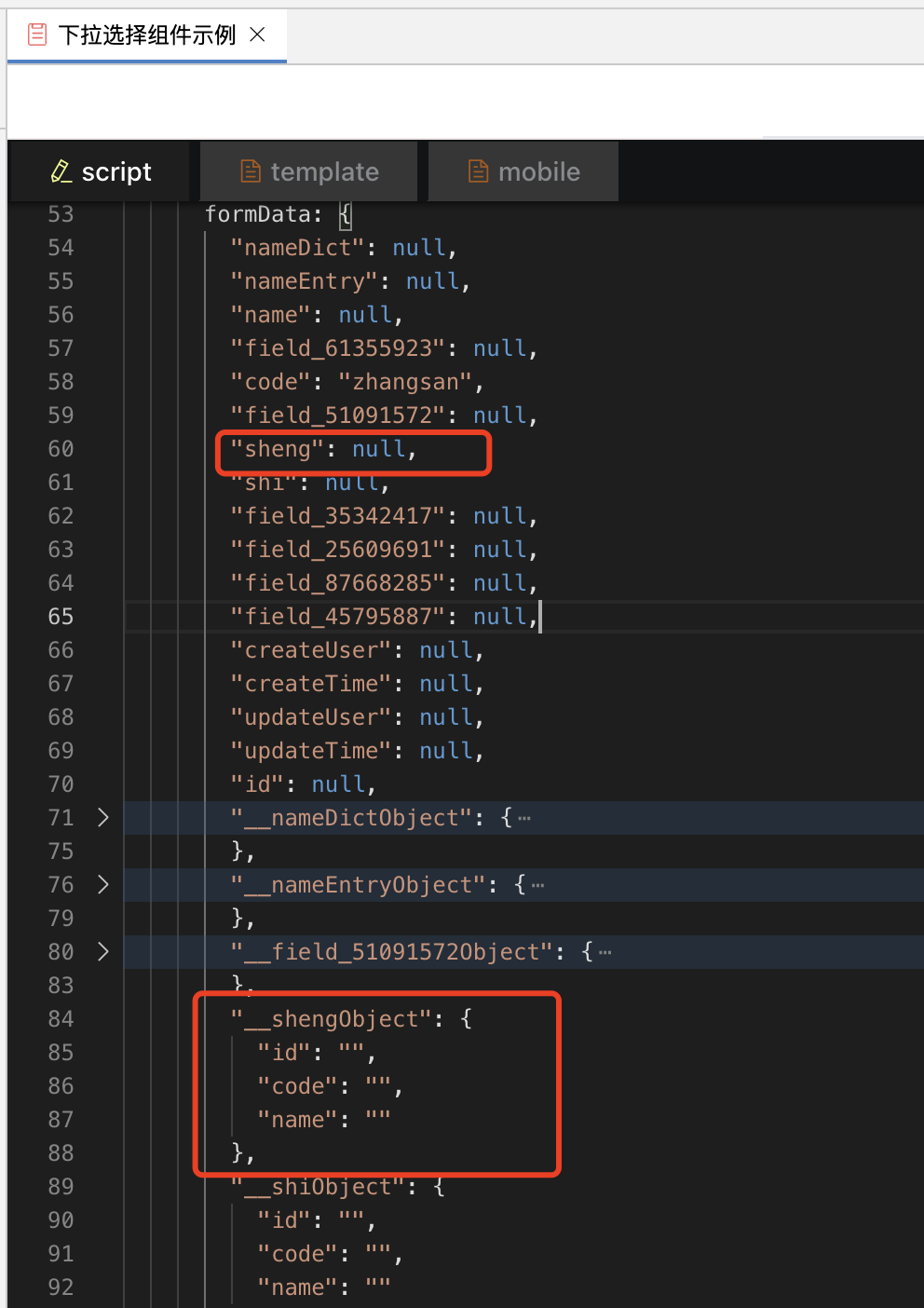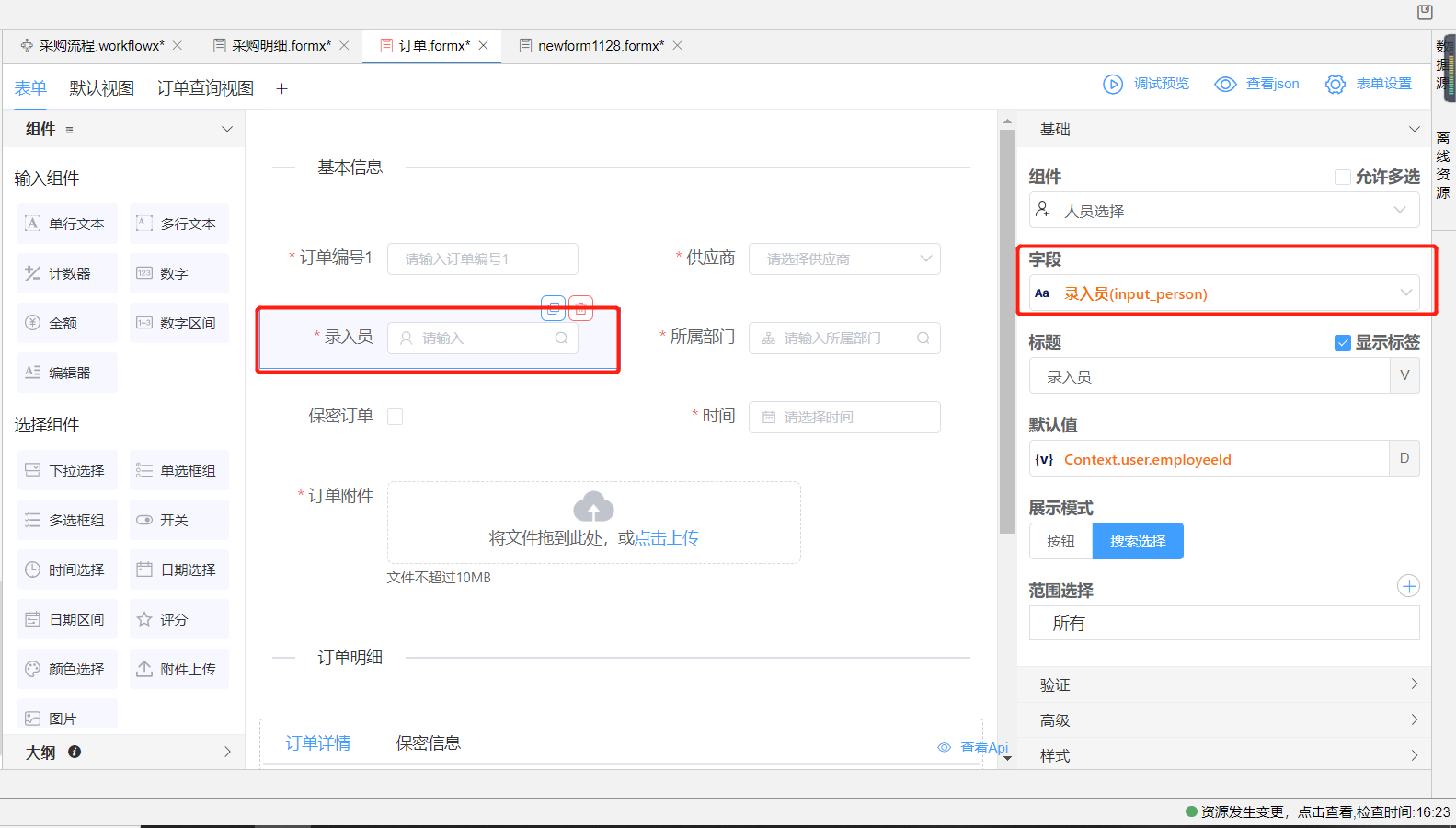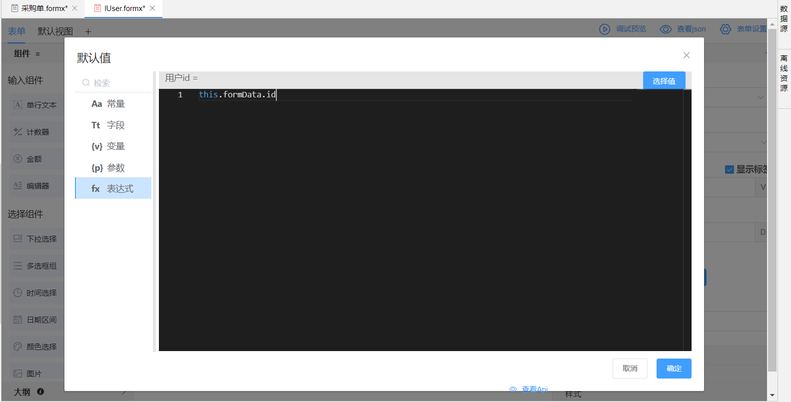 此外,下拉选择组件绑定数据实体字段后,为它的数据来源绑定数据实体,也可生成系统对象。生成的系统对象可用this.formData.系统对象名拿到该对象数据。
