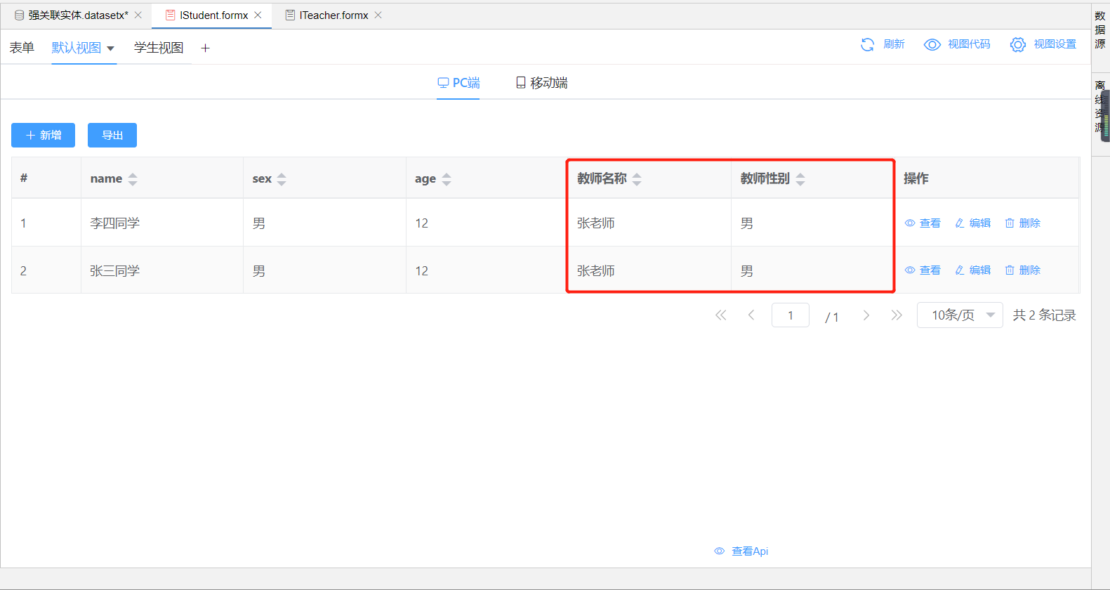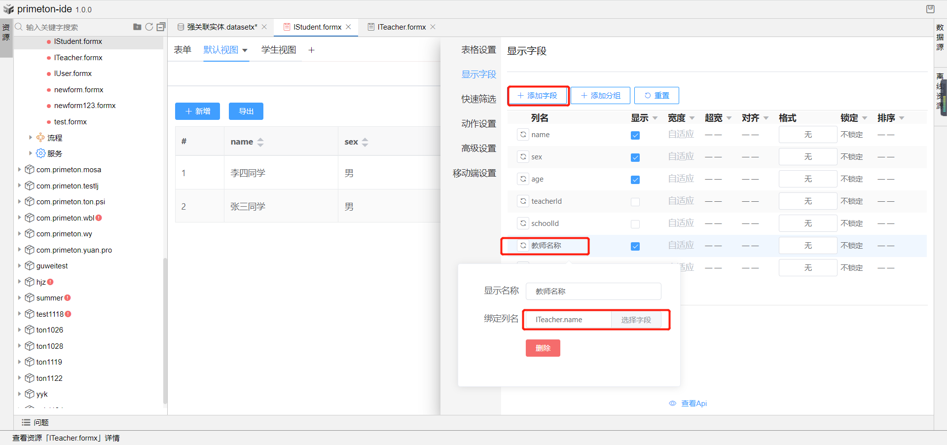 同时在IStudent实体中每条数据都会加载Iteacher的关联实体,在IStudent的视图中,可以添加绑定Iteacher的列字段,如下图为教师名称绑定列名ITeacher.name字段,这样每条IStudent数据都可以展示关联的ITeacher信息。