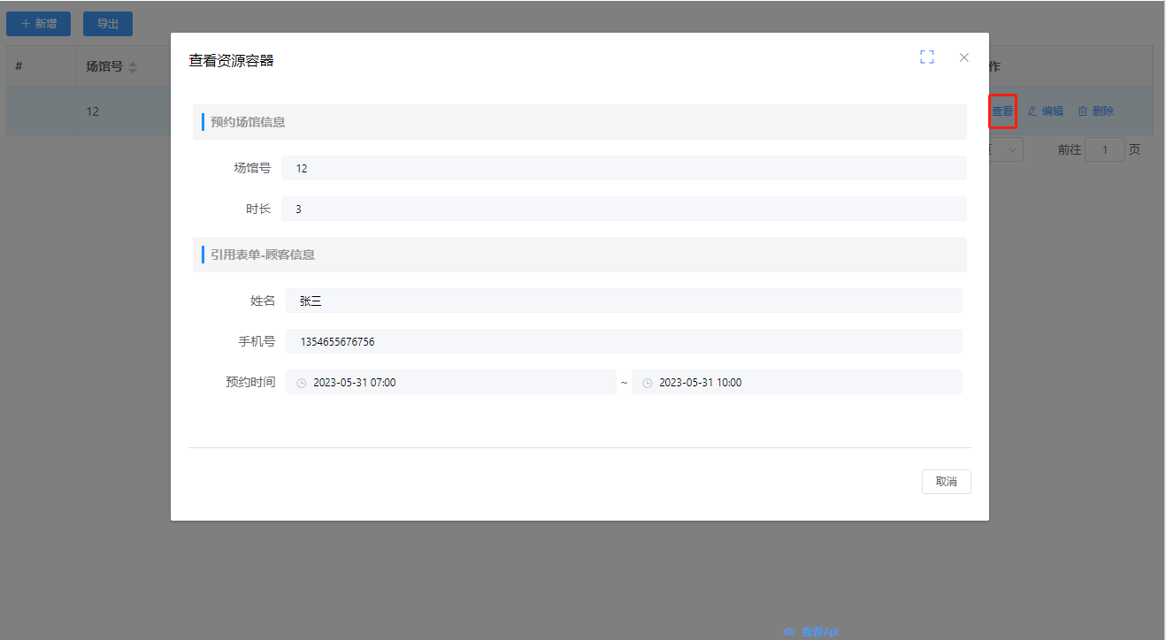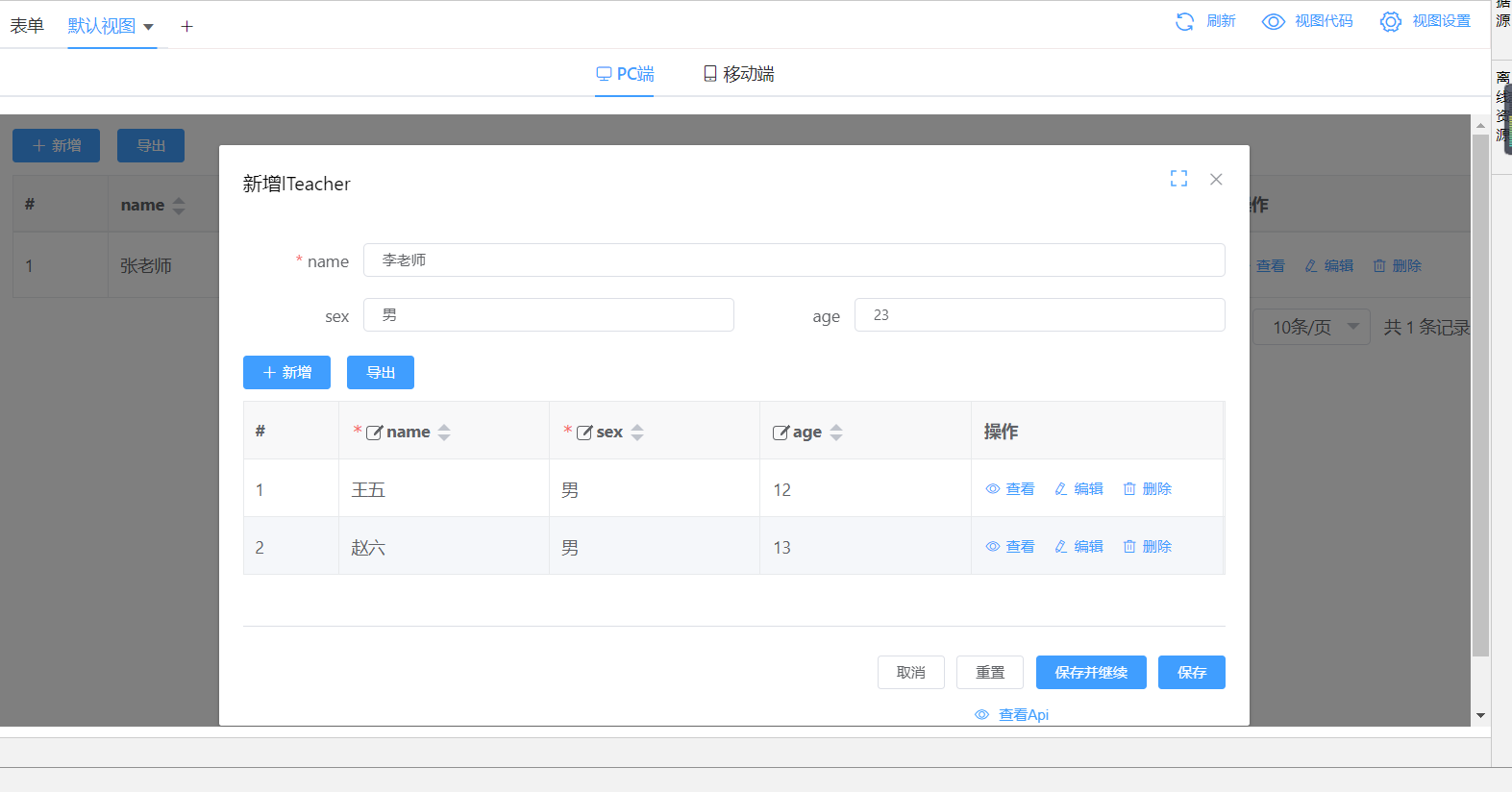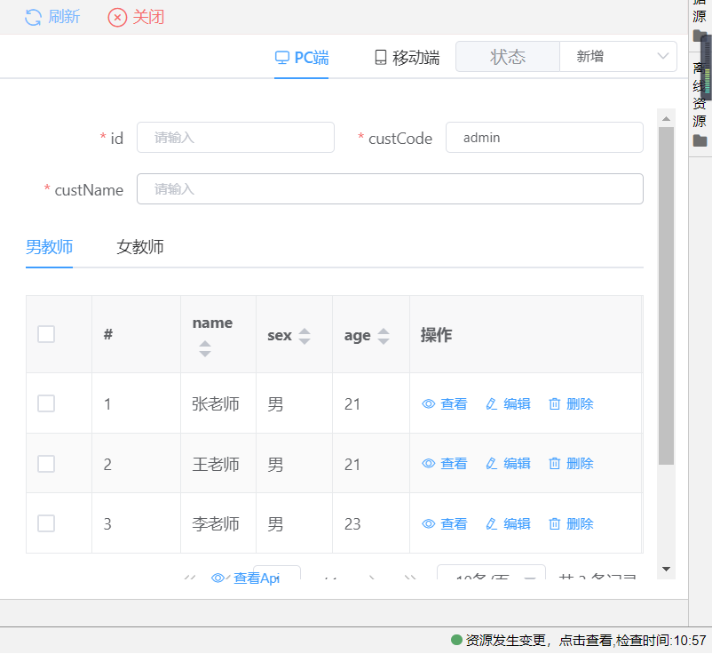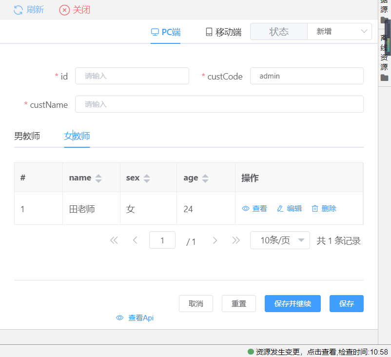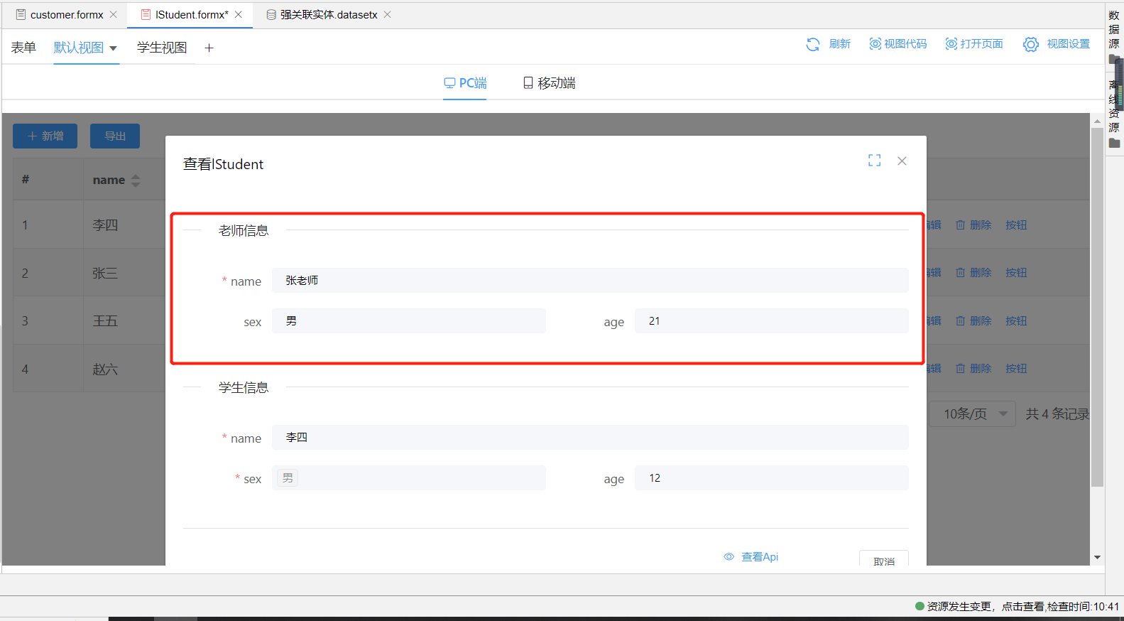示例场景一:学生信息表单页面使用页面容器绑定教师信息表单资源,在查看学生详细信息时展示出该名学生班主任的信息(注:此时,教师与学生的实体模型关系为双向1:n,为页面容器绑定教师实体字段即可);