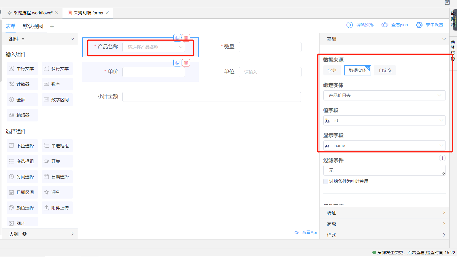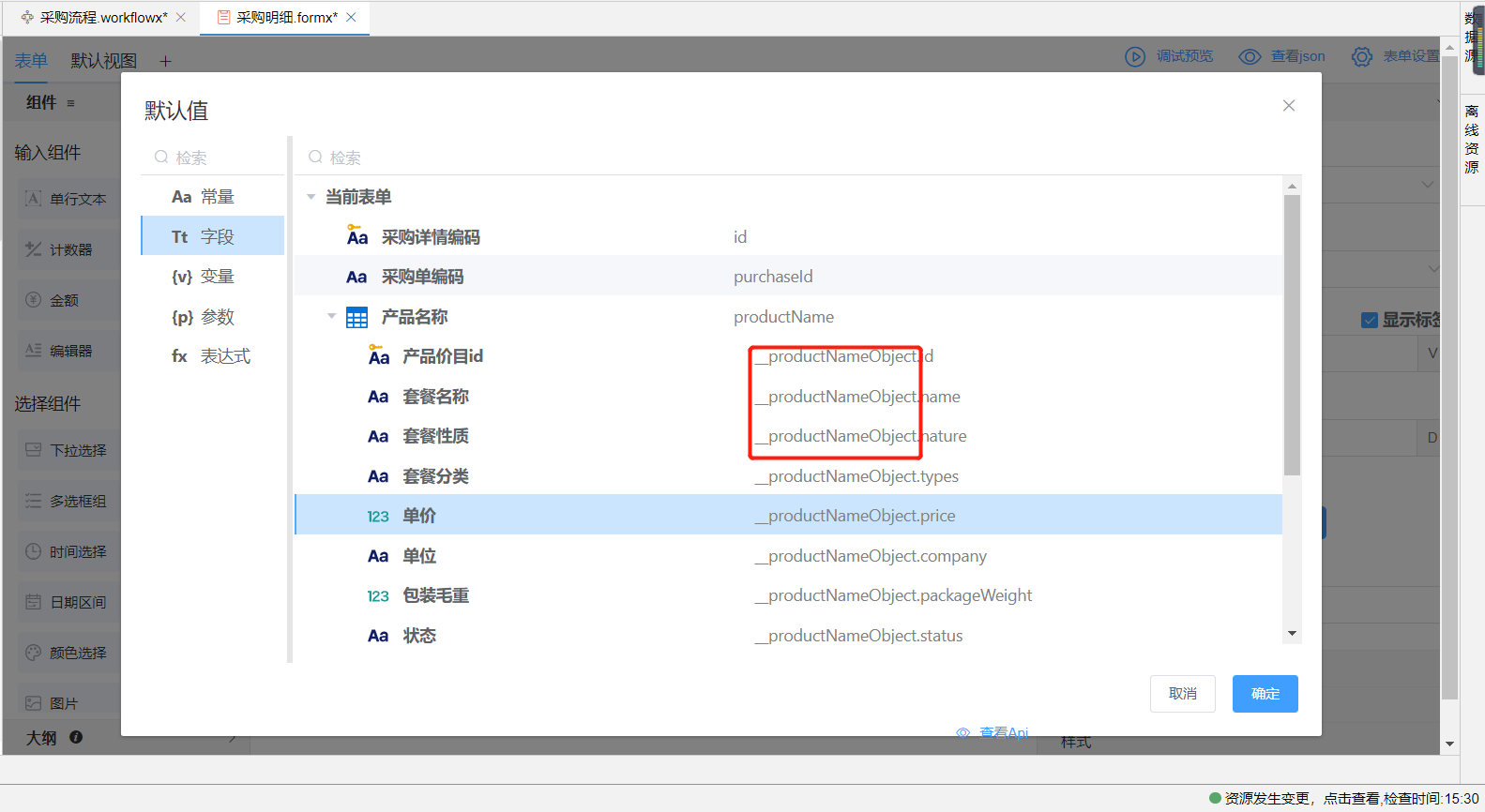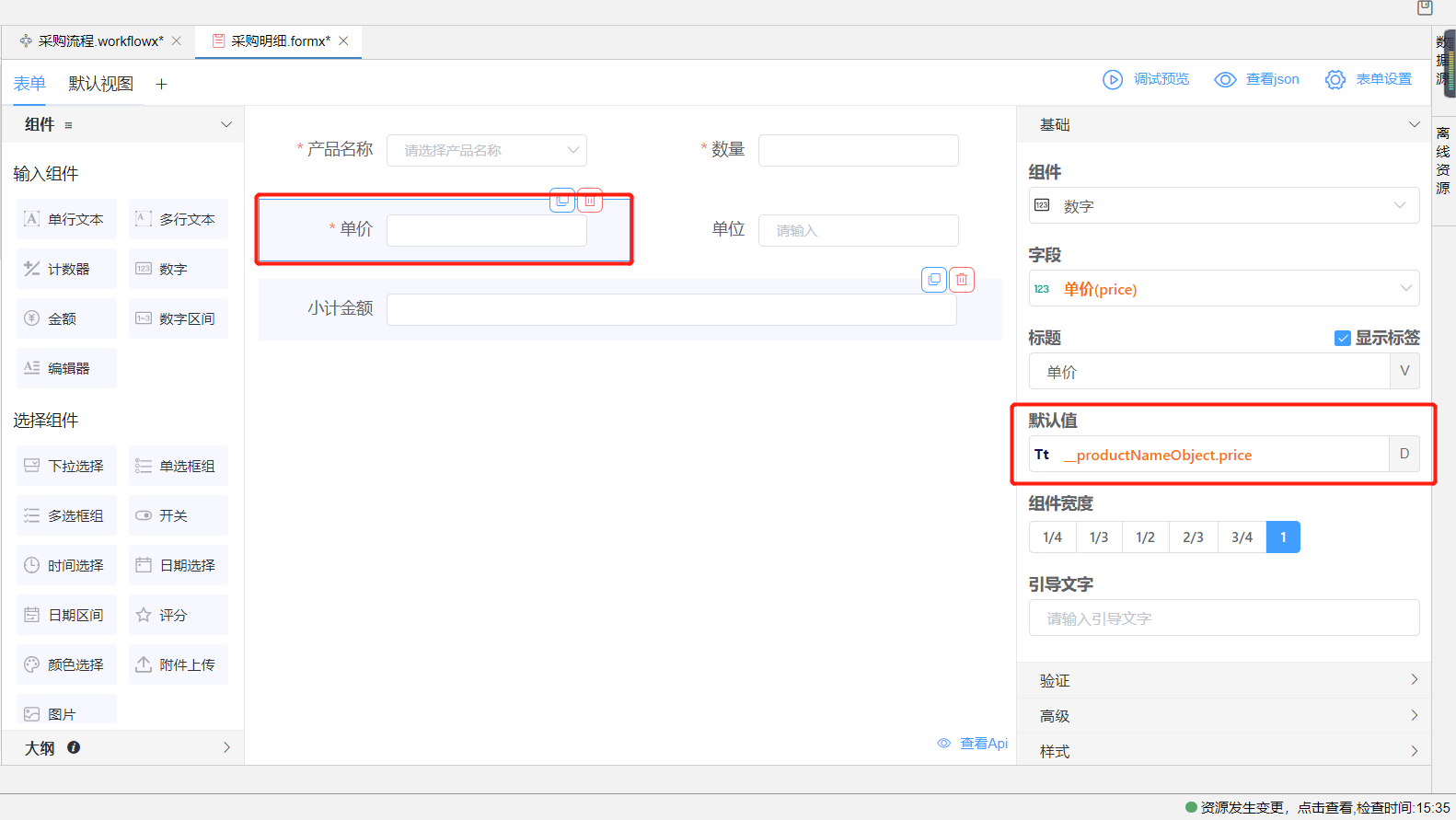 同时在当前表单生成一个系统对象__productNameObject,可为单价和单位组件设置默认值,该默认值就为这个系统对象中的单价和单位字段值。