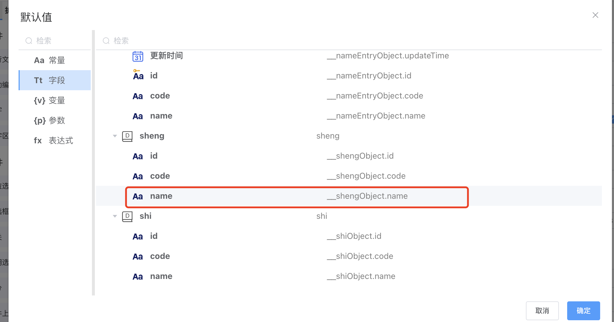 系统对象指当前表单内所生成的系统已有对象。例如当引入选人组件并绑定数据实体字段后,会生成人员Object实体,该实体中含有人员详细信息字段,以供后续赋值使用。机构组件、上传组件等在绑定完实体字段后都可生成系统对象