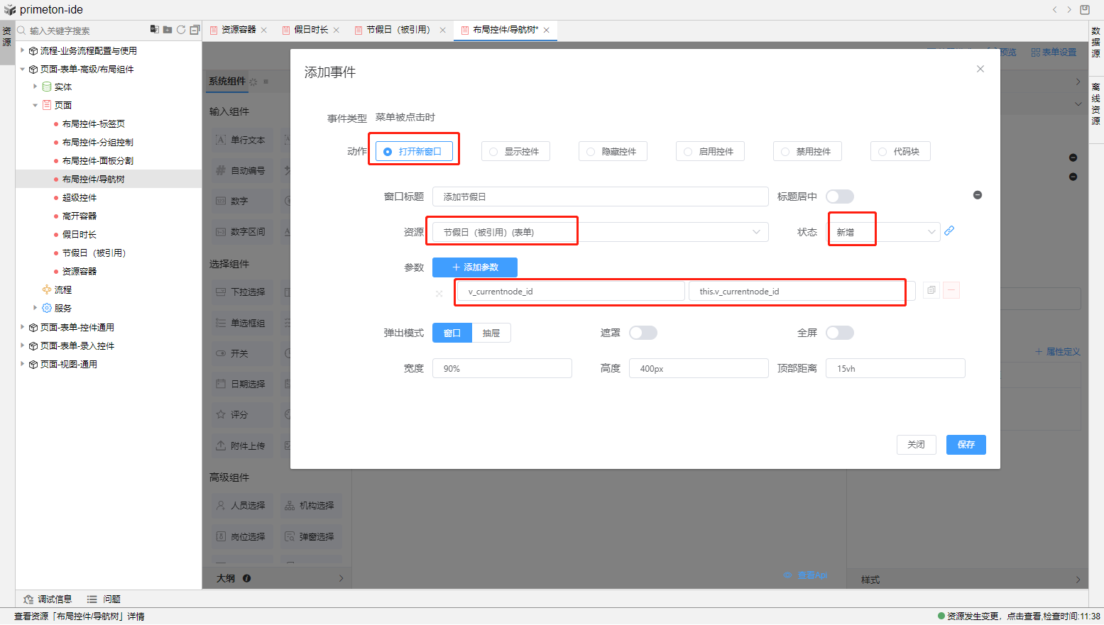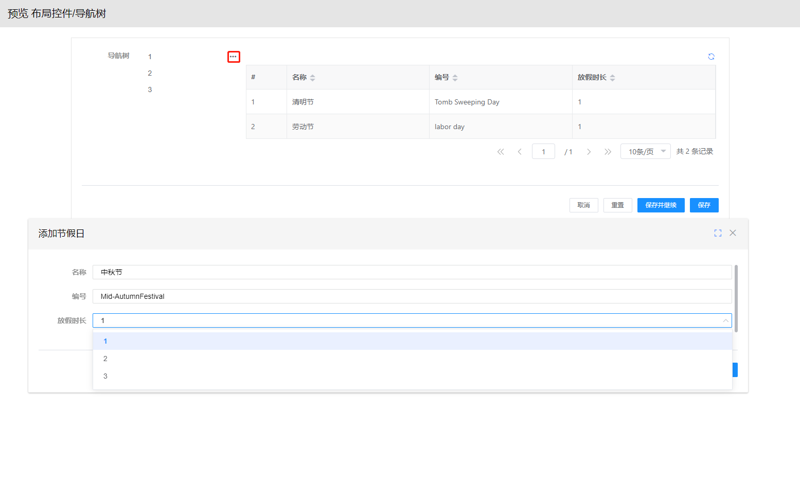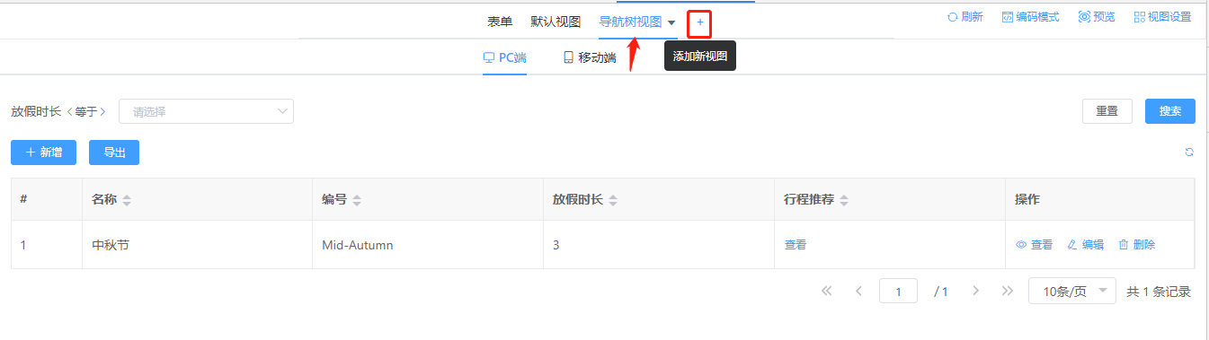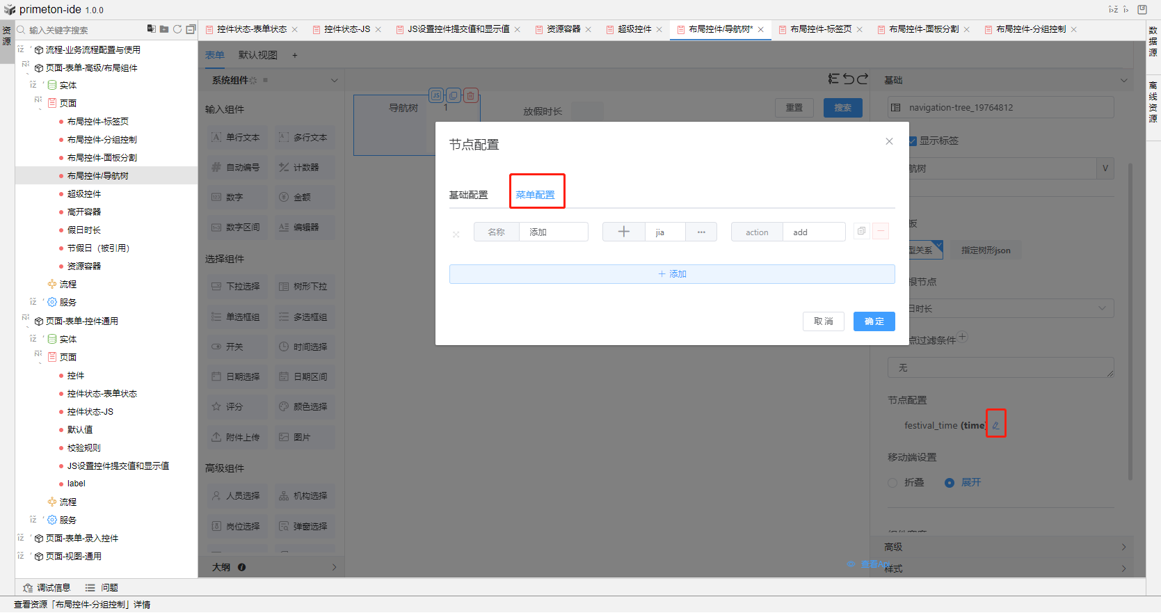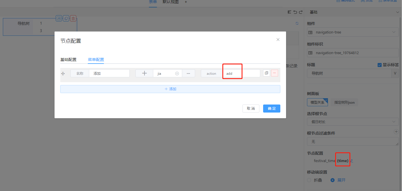 步骤1. 左侧导航树组件—动态数据选择<假日时长>实体,节点配置的基础配置-显示字段(time)和菜单配置添加action(add)
