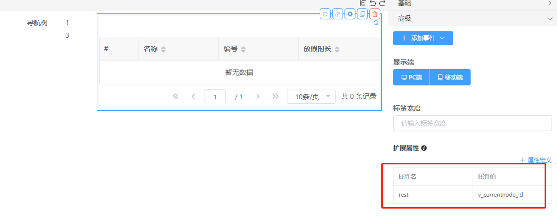 步骤5. 右侧资源容器组件 的 页面资源绑定<导航树视图>,高级的扩展属性添加参数rest,绑定的值为新建的变量(v_currentnode_id)
