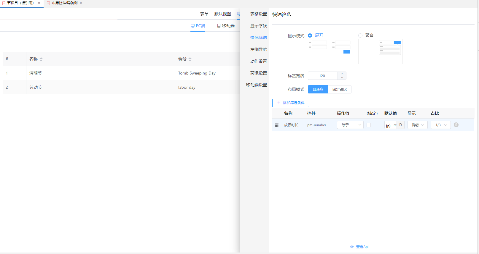 在视图设置的高级设置—快速筛选,添加删选条件(放假时长);默认值选择参数rest;显示选择隐藏
