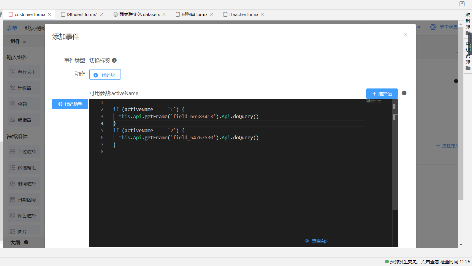 当标签页切换时也需要去查询视图数据,所以在标签页组件的高级中创建切换标签事件,当标签页切换时执行不同视图的查询事件。