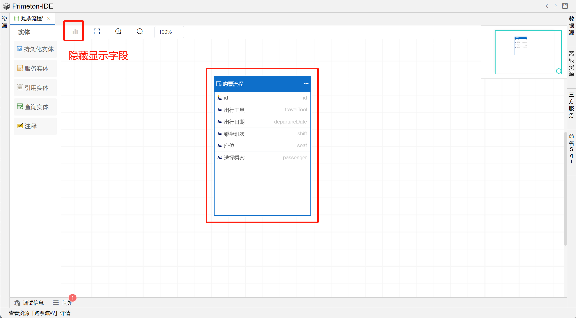 实体面板(位置为图一中2)提供了多种类型的实体供用户选择,包括持久化实体、服务实体、引用实体、查询实体和注释。用户可以根据自己的需求和目的选择相应的实体类型,并根据需要对其进行定制和配置。