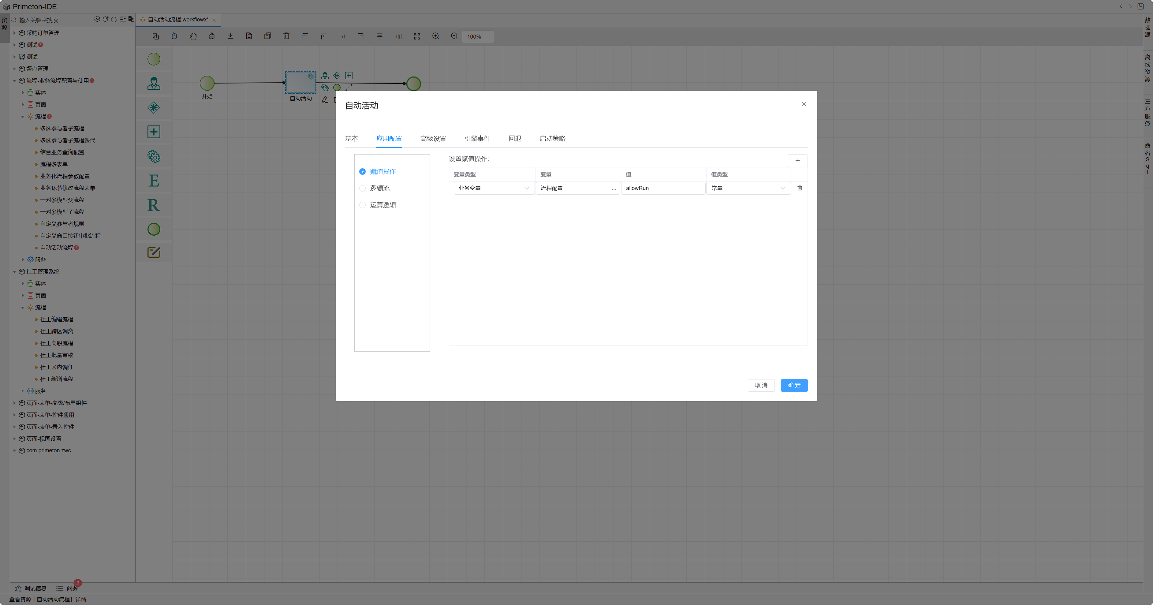 自动活动是指在流程执行期间由系统或应用程序自动执行的活动。自动活动通常不需要人工干预,而是由流程引擎执行。在自动活动中我们有多种调用逻辑,如:赋值操作、逻辑流调用、运算逻辑调用、EOS服务调用和REST服务调用。自动活动在执行过程中很有可能会出错,我们提供了多种异常处理机制,如:异常回滚、忽略异常、进入异常状态,等待人工干预和自动路由到其他活动,活动终止。