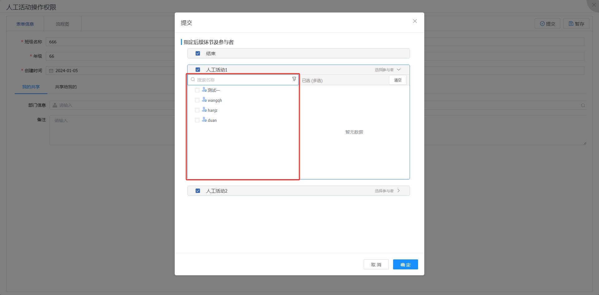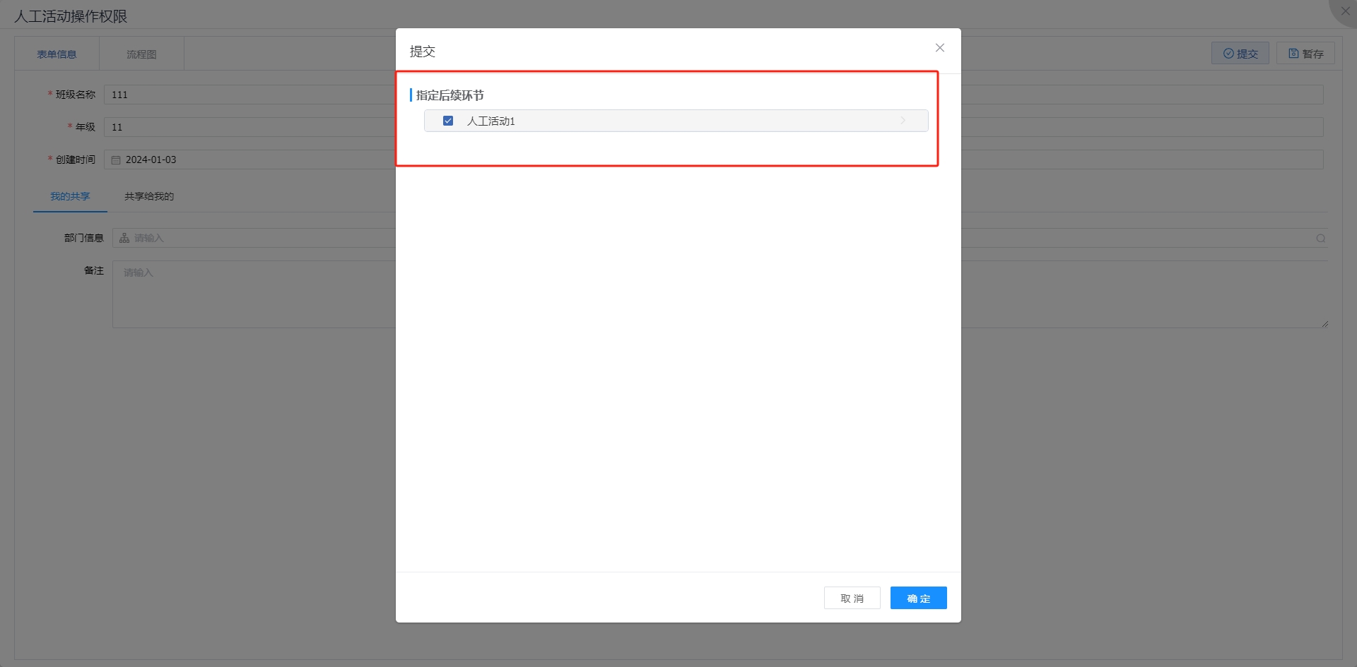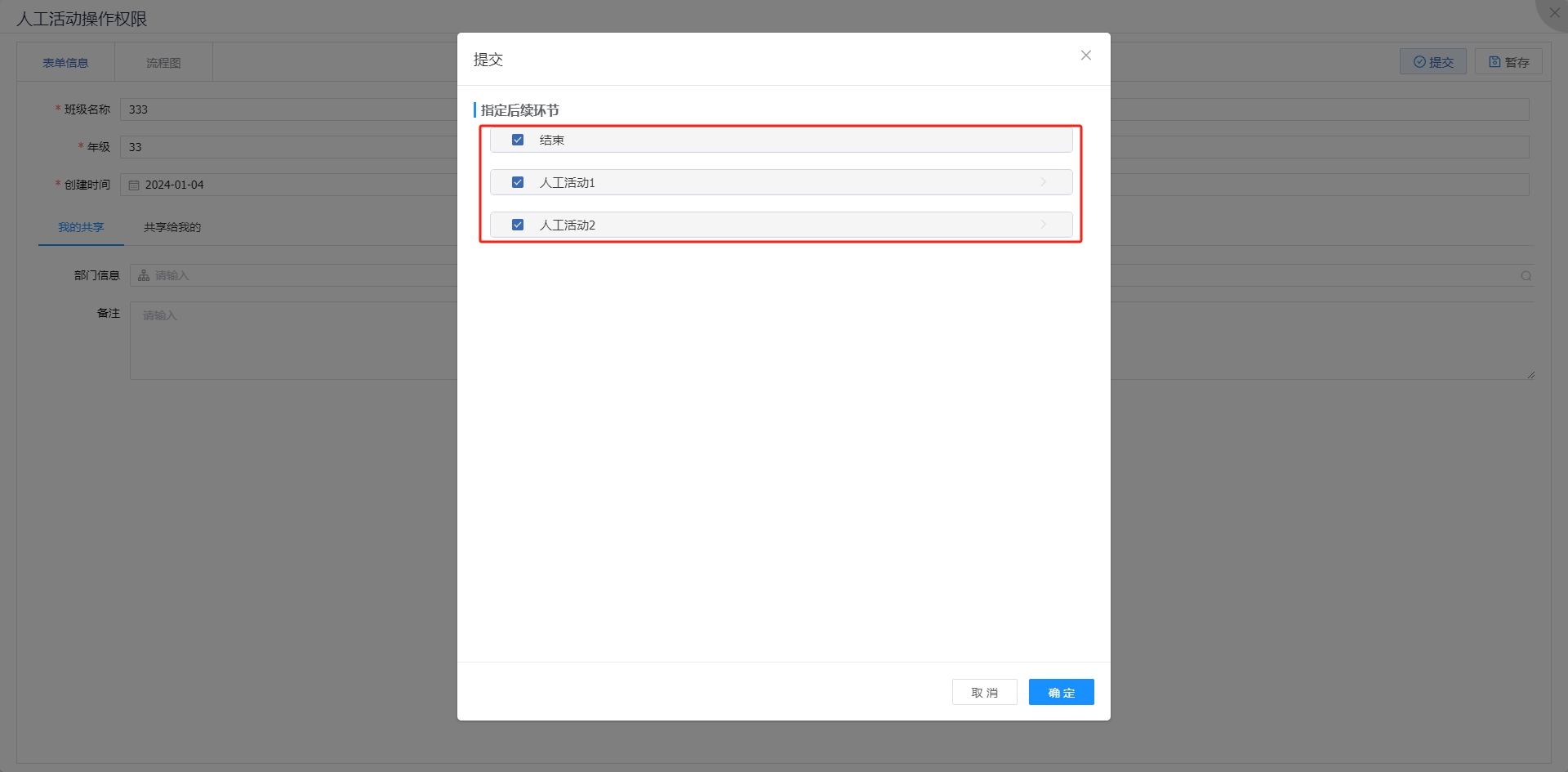 此时再次提交流程,可以看到指定后续环节范围。