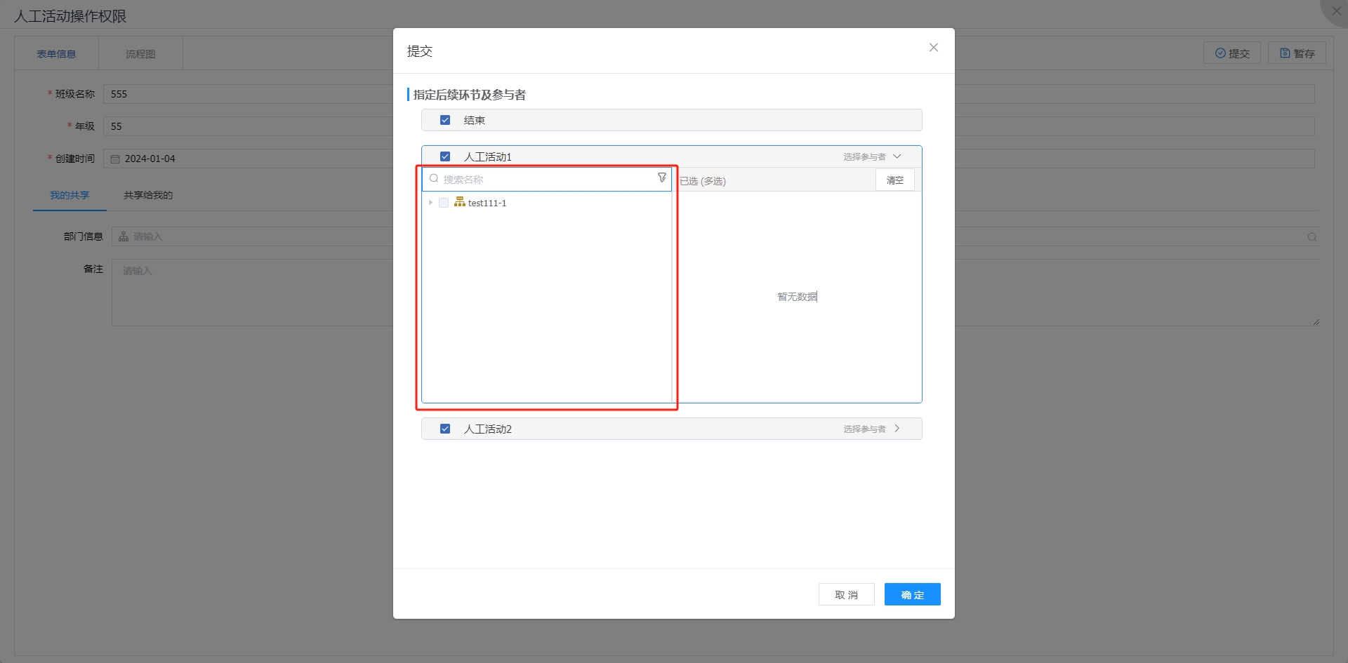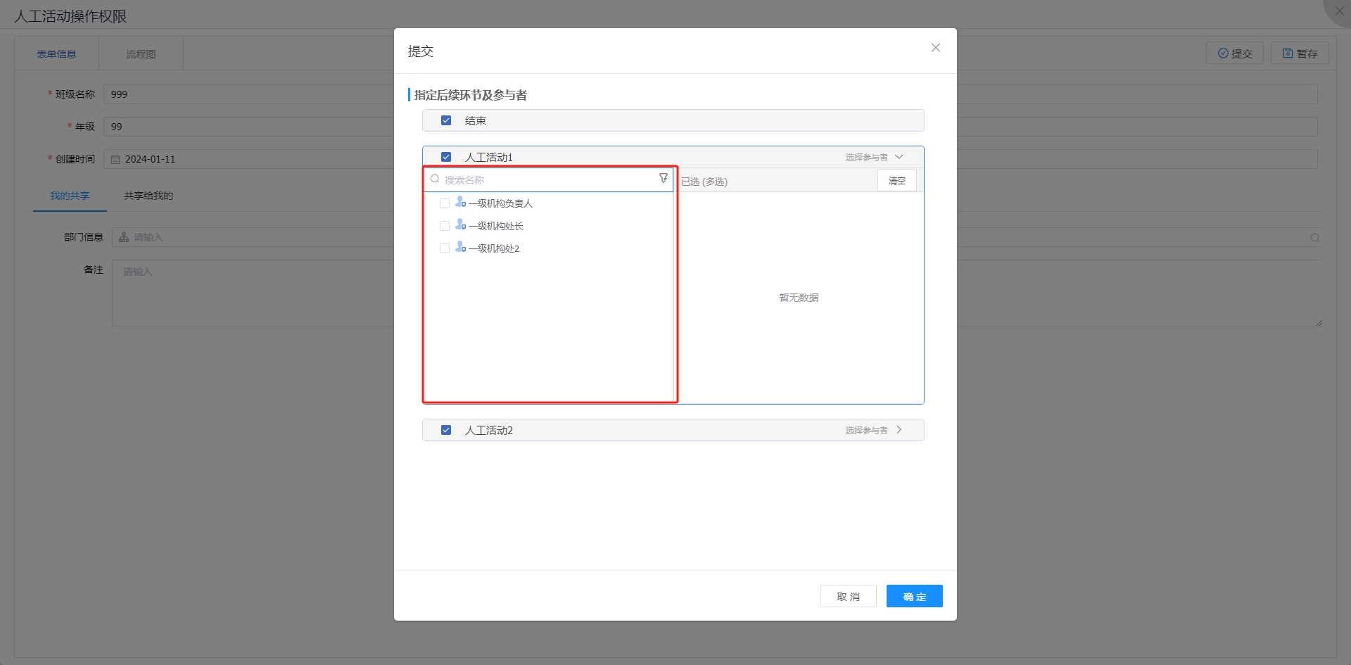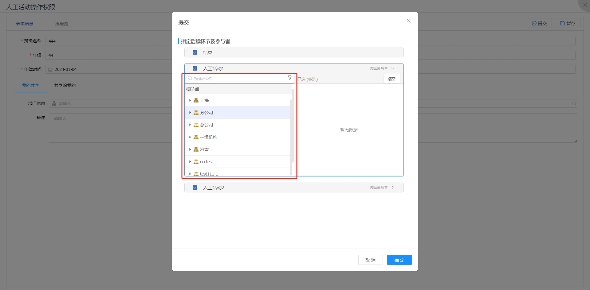 此时再次提交流程,可以看到指定后续环节范围。