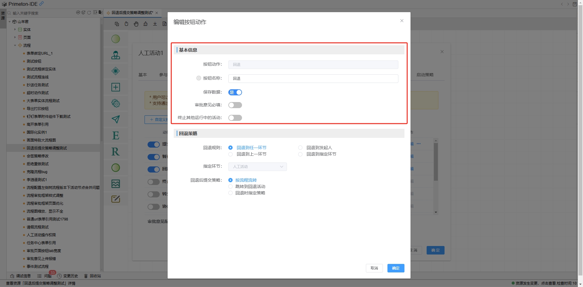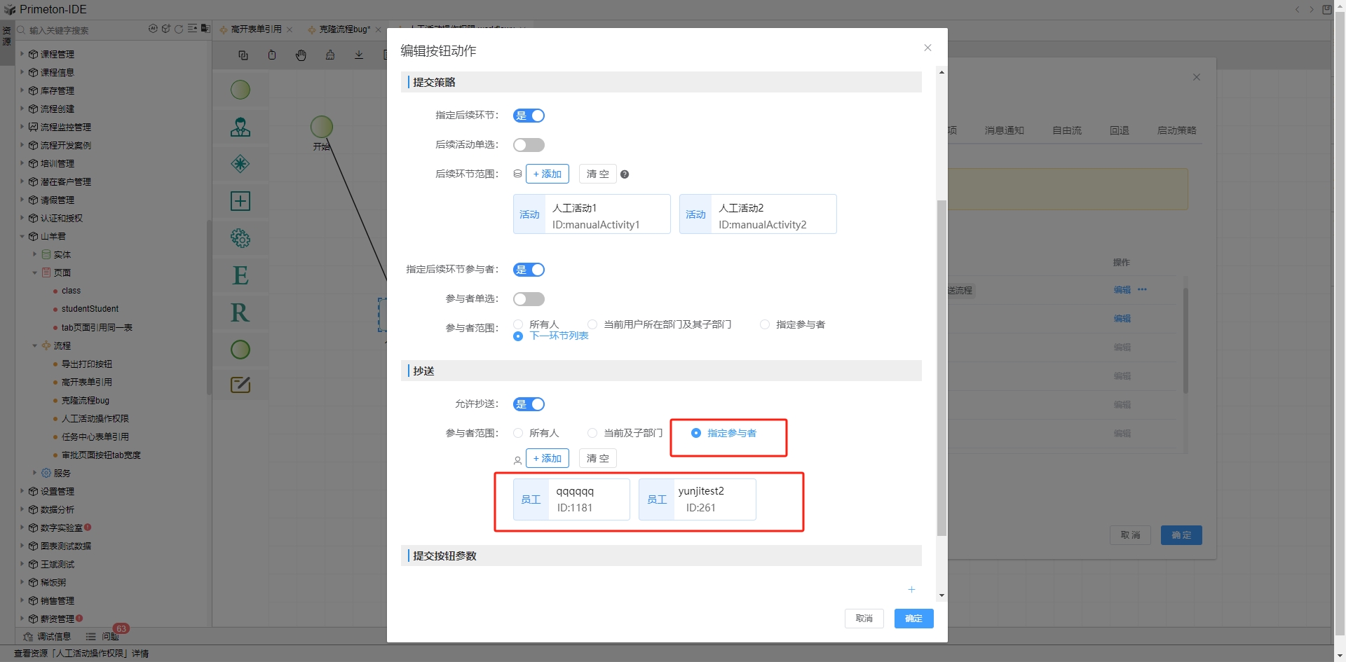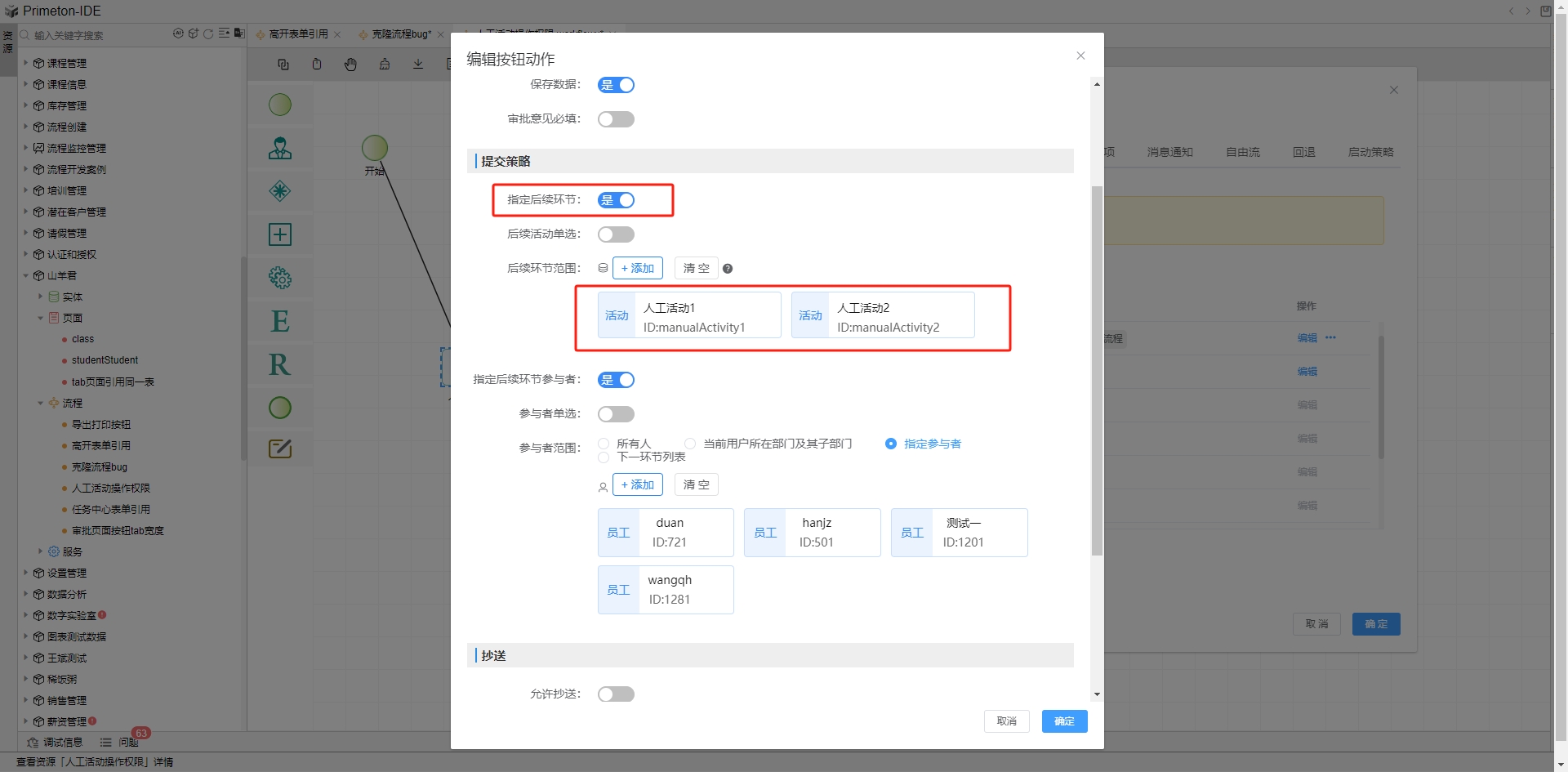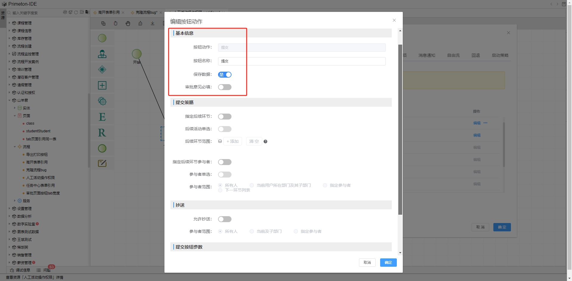 提交动作,触发后流程会提交当前活动节点。点击列表中提交行的编辑按钮,打开提交动作配置弹框。