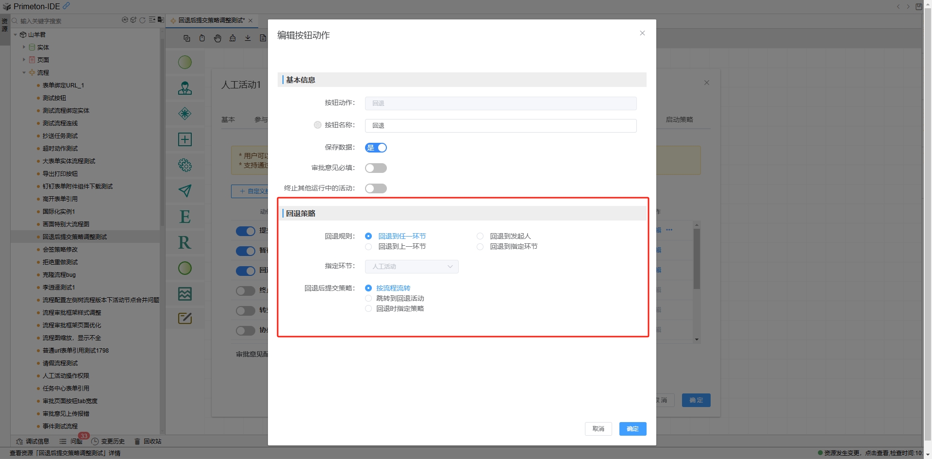 - 回退时指定策略,即将指定策略的时机延迟至运行期(流程审批页面点击回退按钮时),可选项为按流程流转。如下图示。