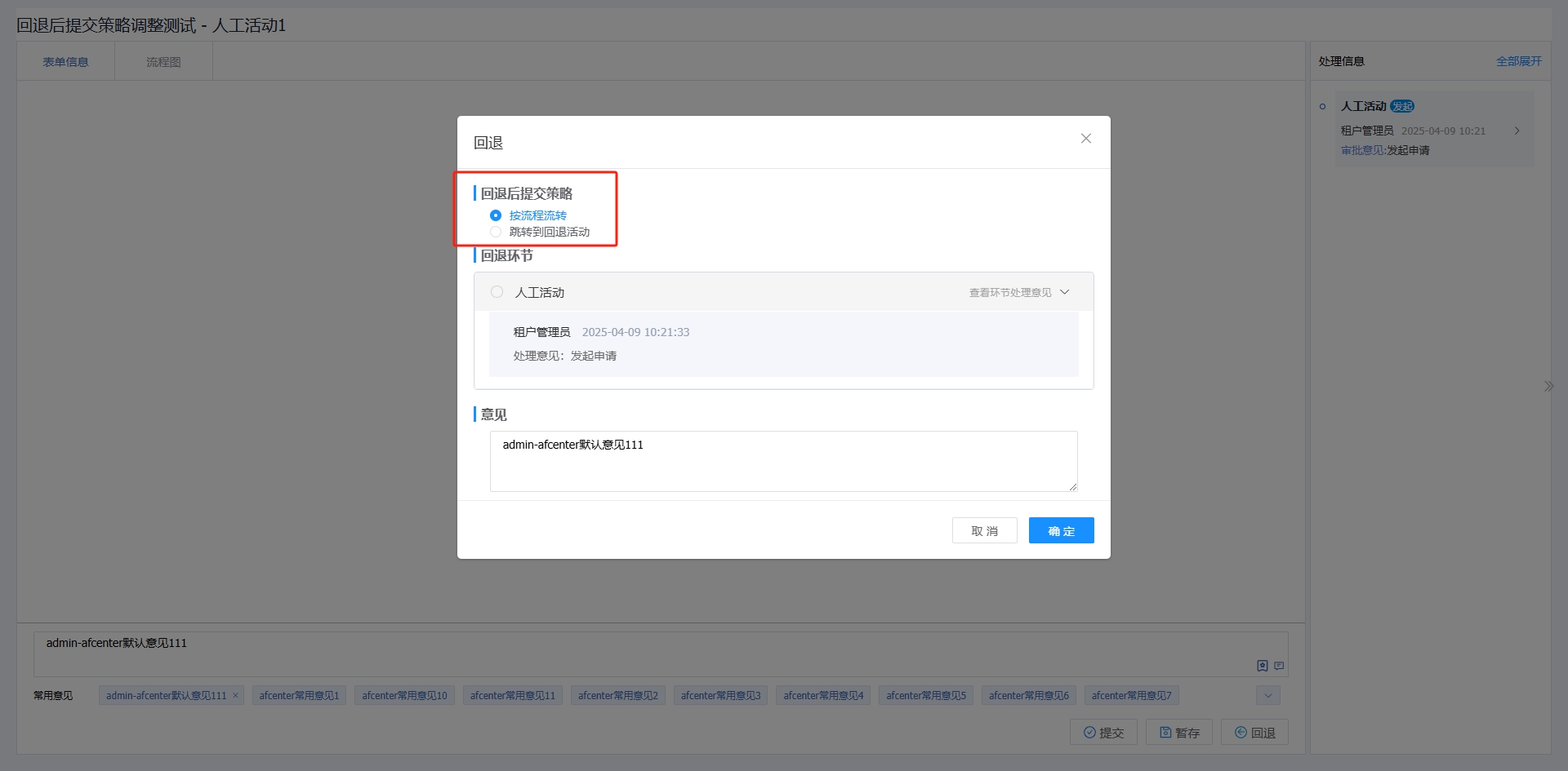- 回退到任一环节 - 当前环节点击回退按钮后可在页面弹框中选择回退到哪一环节。