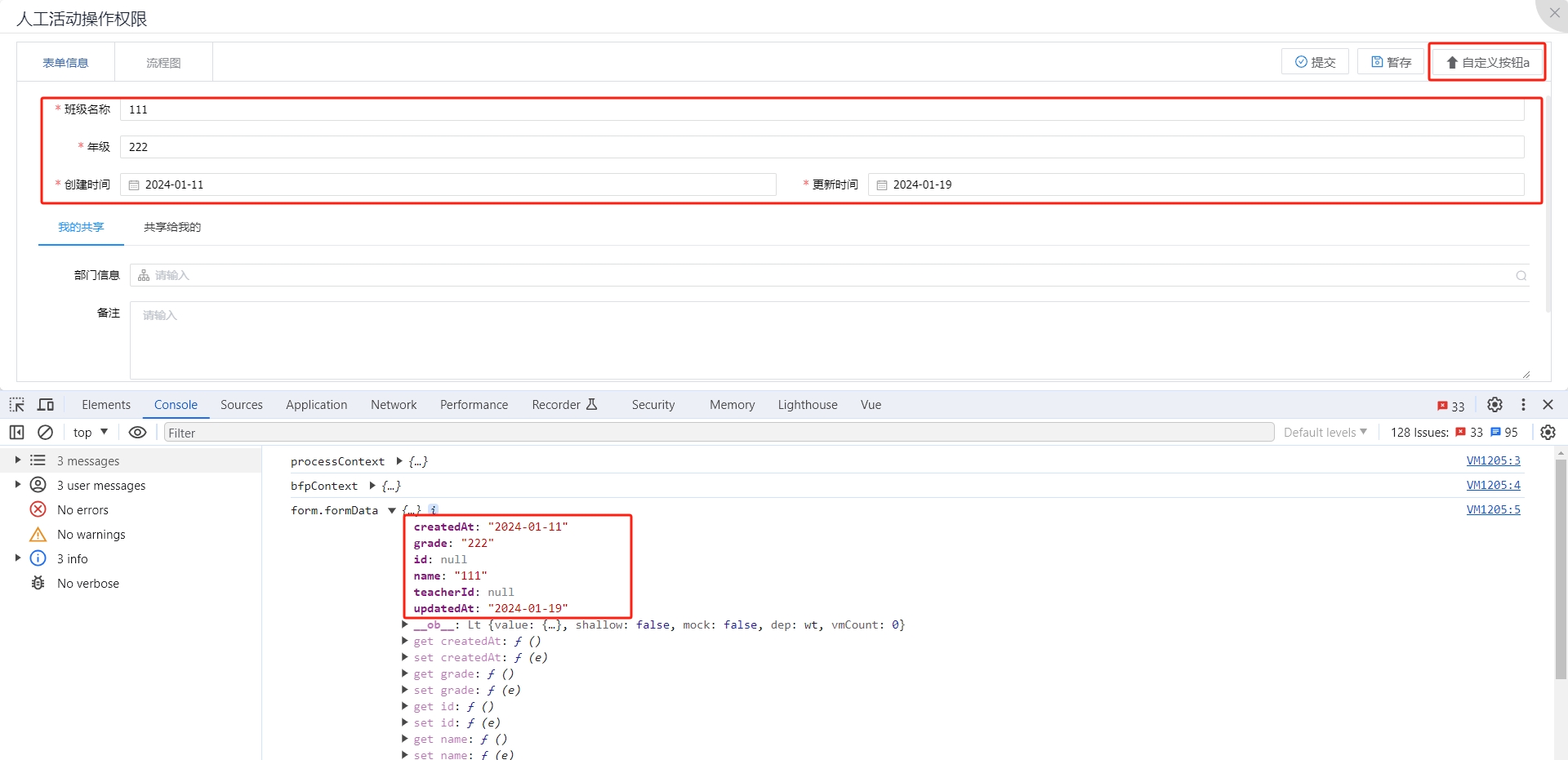 在流程审批环节点击添加的自定义按钮,在控制台可以看到添加的脚本打印输入。