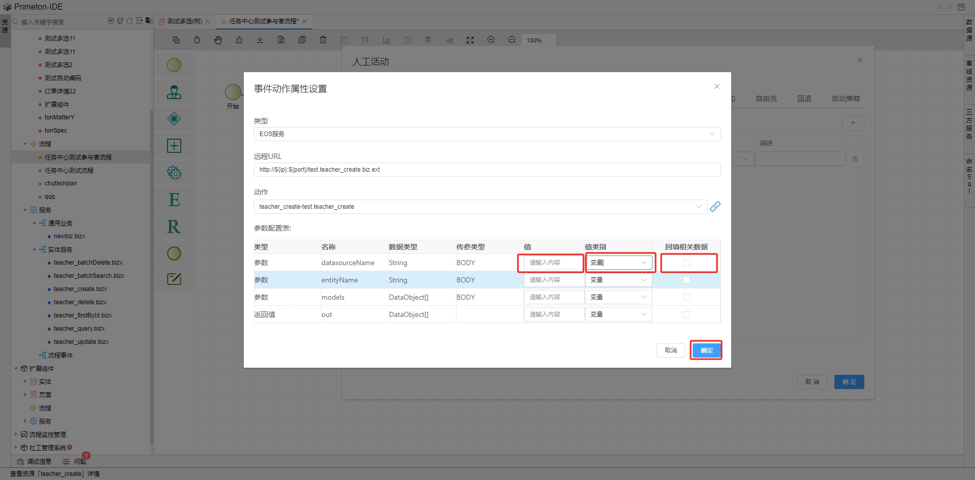 注:如果勾选了"回填相关数据"复选框,表示调用服务后的相关参数以及返回值将加入到相关数据中去。