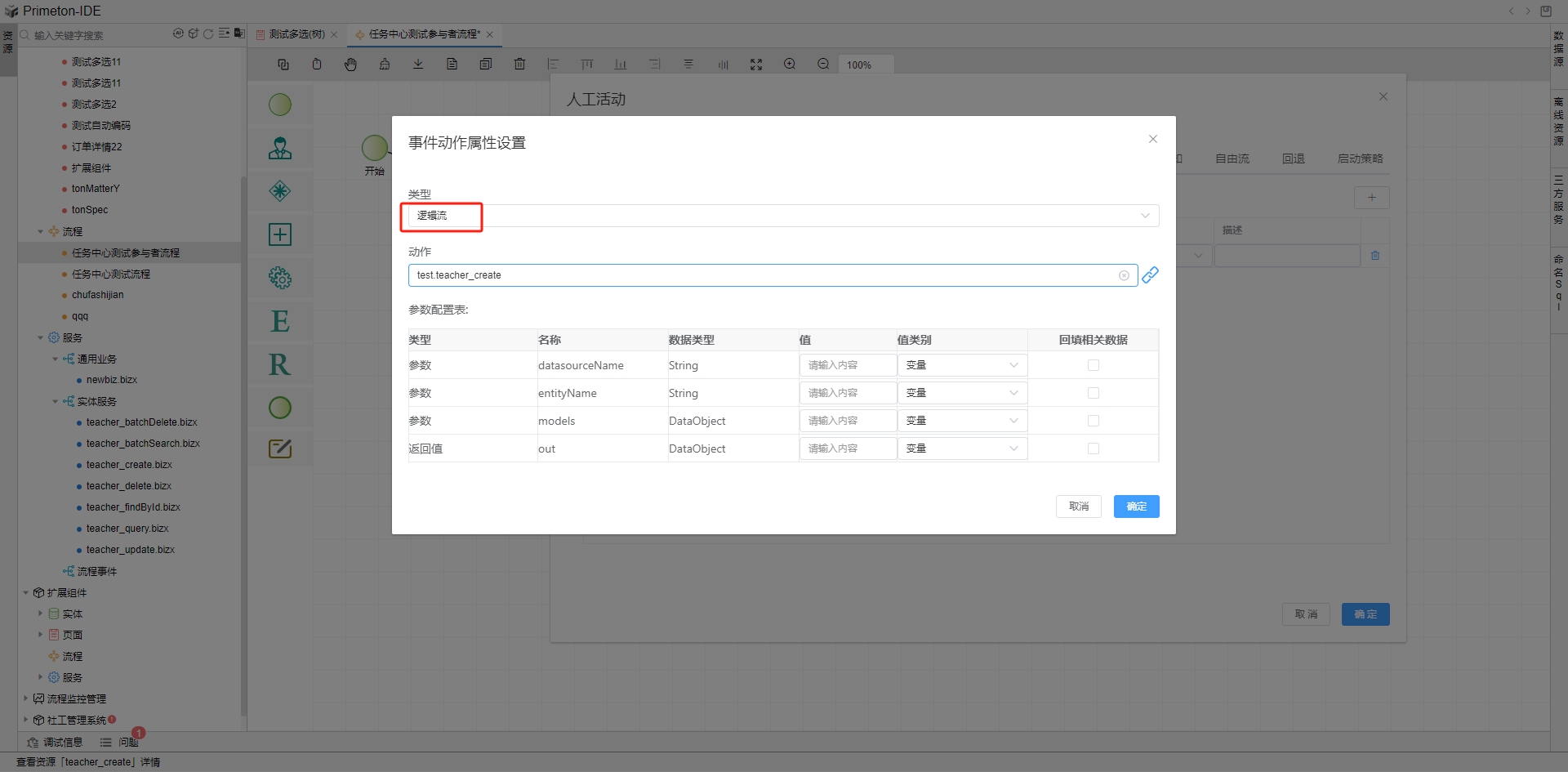 其中逻辑流必须流程事件类型的服务。创建时已经将逻辑流入参出参定义好了,只需要编写业务逻辑即可。