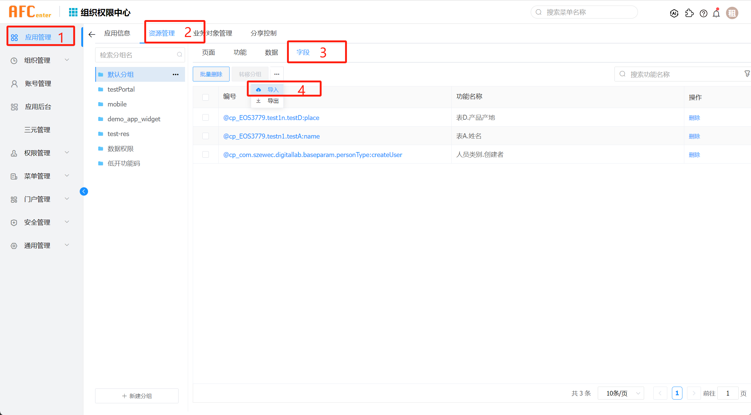 选择资源分组后,点击字段,选择导入。导入的字段为提前在表单中开启控制的字段。