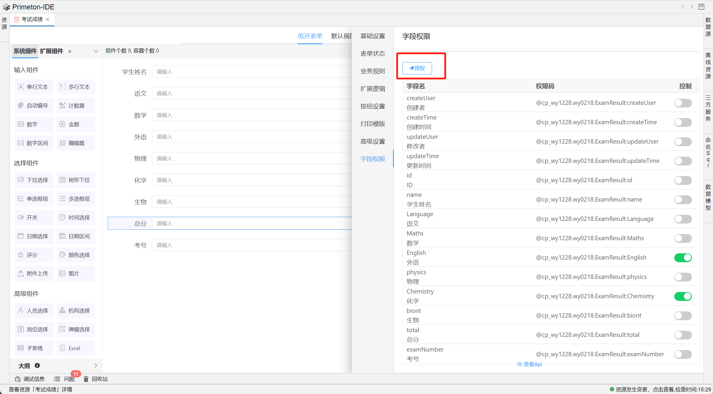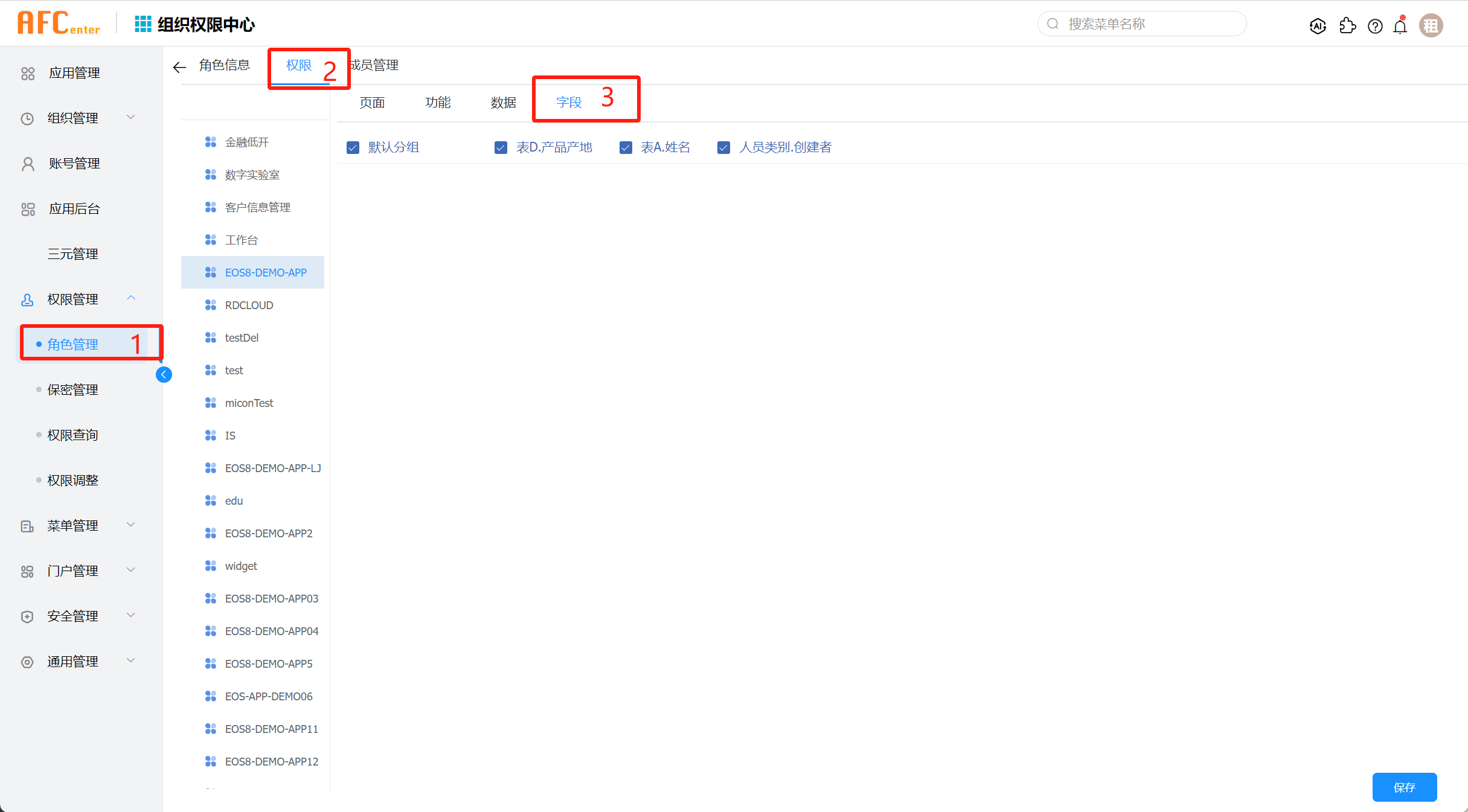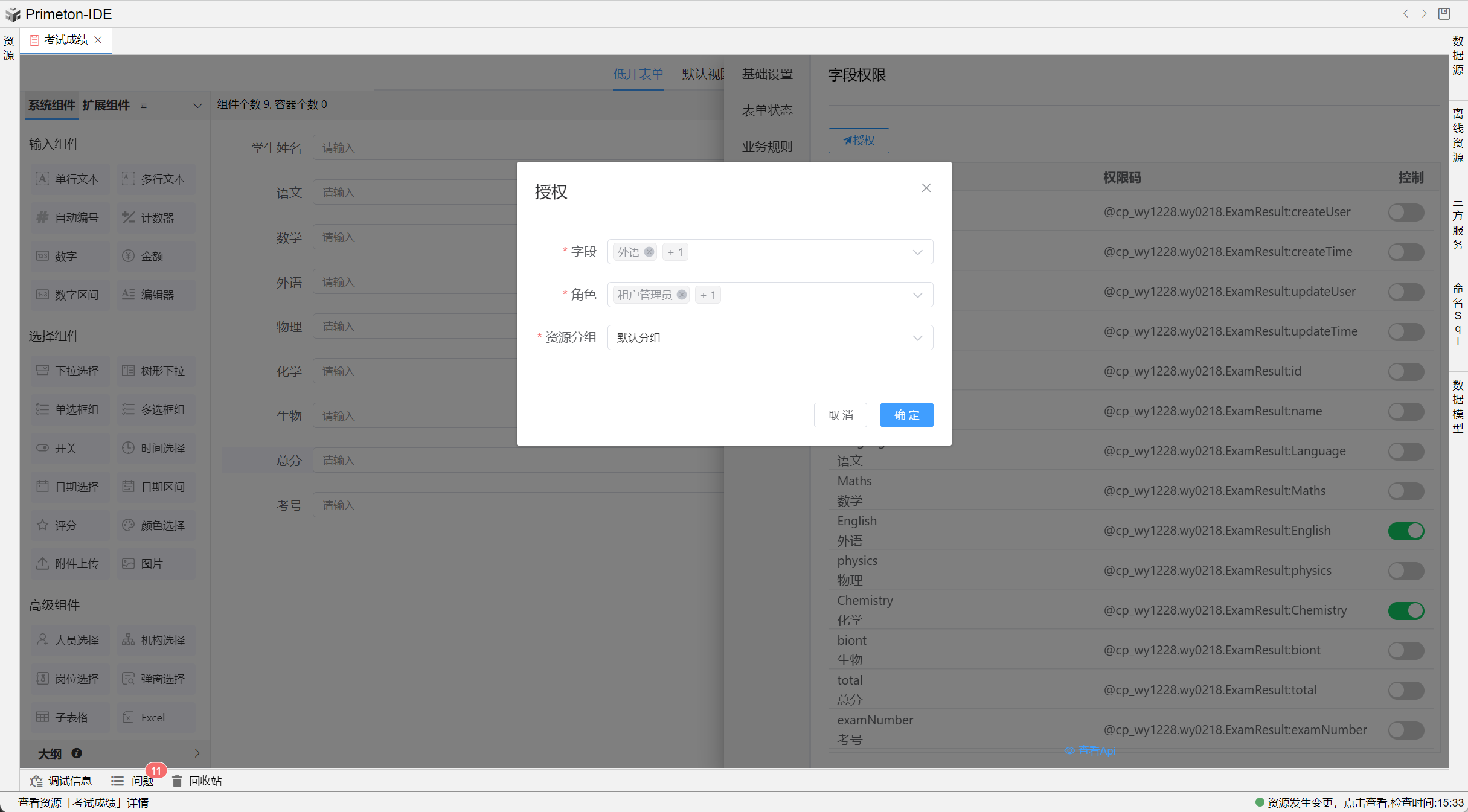 授权配置项为字段、角色、资源分组。字段和角色允许多选,且默认字段为已经开启控制的字段。
