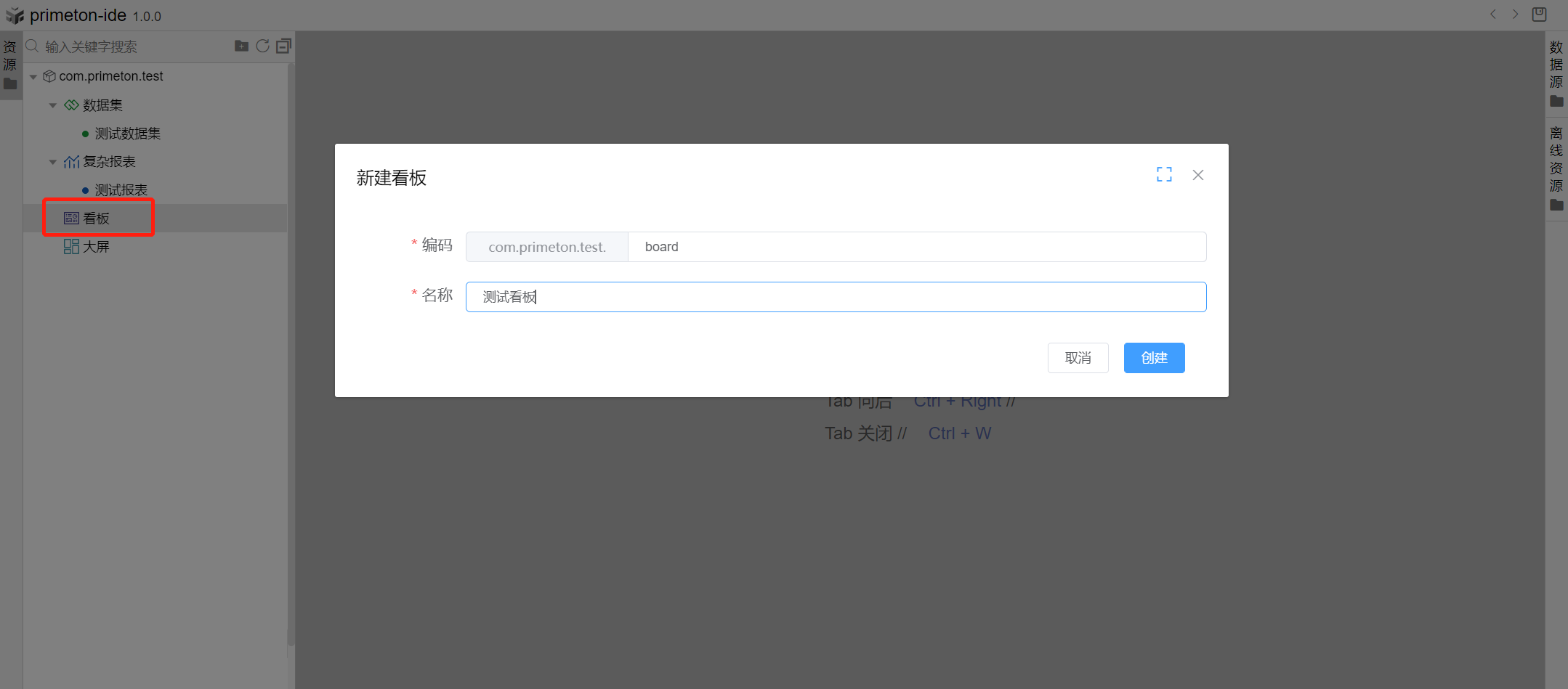 选择构件包com.primeton.test的节点看板,右击创建看板,填写信息,点击创建。