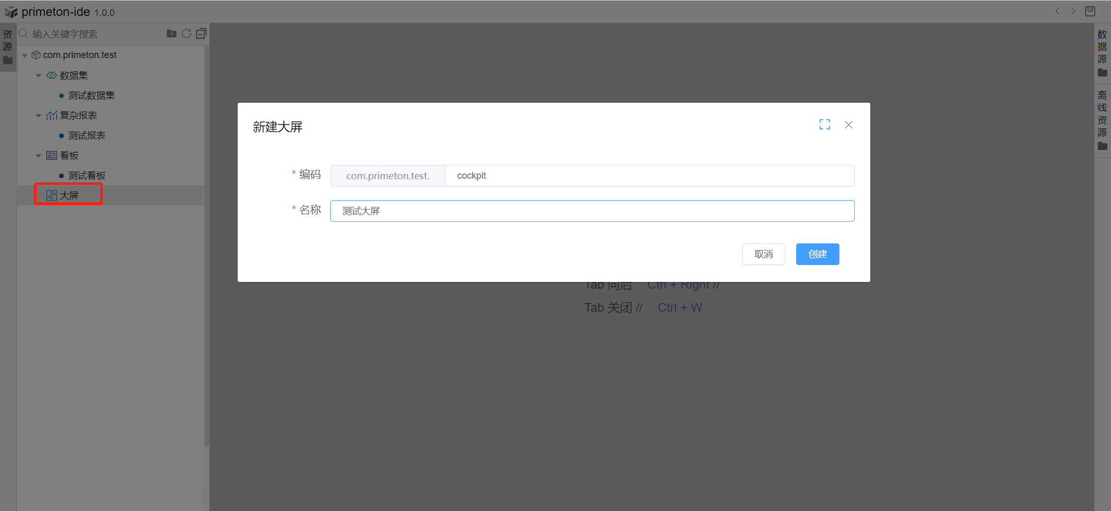选择构件包com.primeton.test的节点大屏,右击创建大屏,填写信息,点击创建。