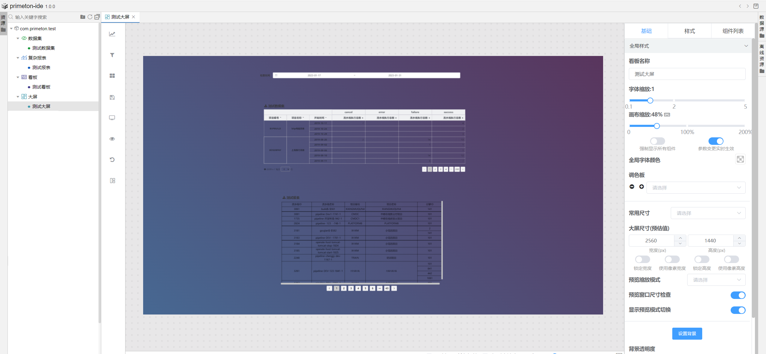 在新建的测试大屏中,编辑其他相关信息,具体开发详解请参考大屏配置 (opens new window)。