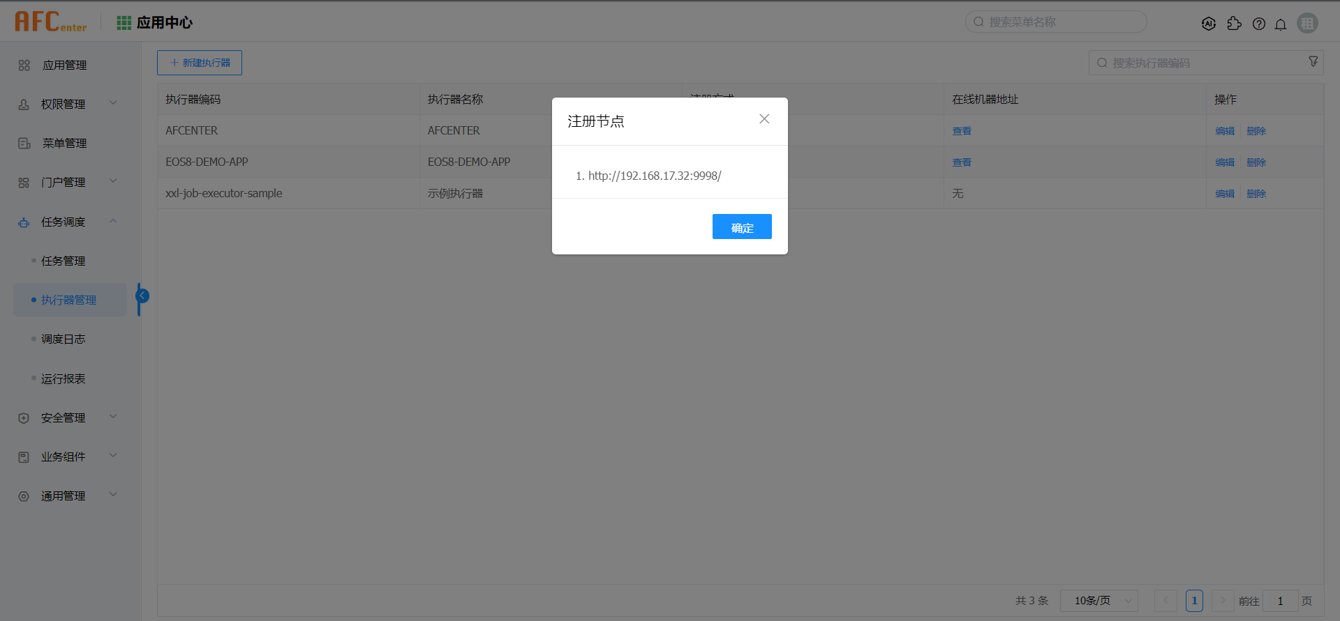以AFCenter应用为例,讲解如何将应用作为调度中心和执行器,配置执行器、设置调度任务,触发任务定时执行。