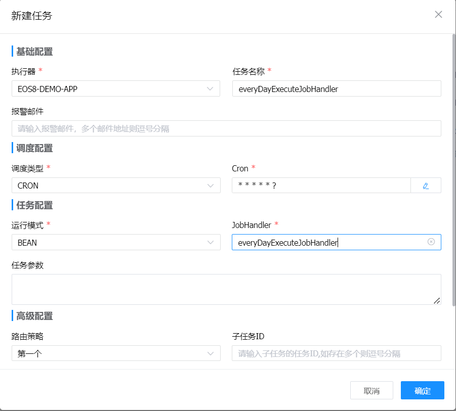 执行器选择EOS8-DEMO-APP,任务名称逻辑流执行(自定义),调度类型为CRON,运行模式为BEAN,JobHandler选择上一步开发的“everyDayExecuteJobHandler”