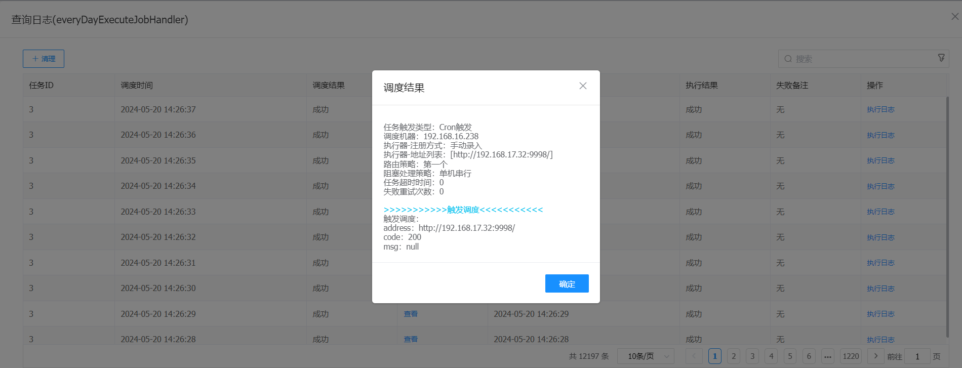 启动定时任务,查询日志查看启动状态。