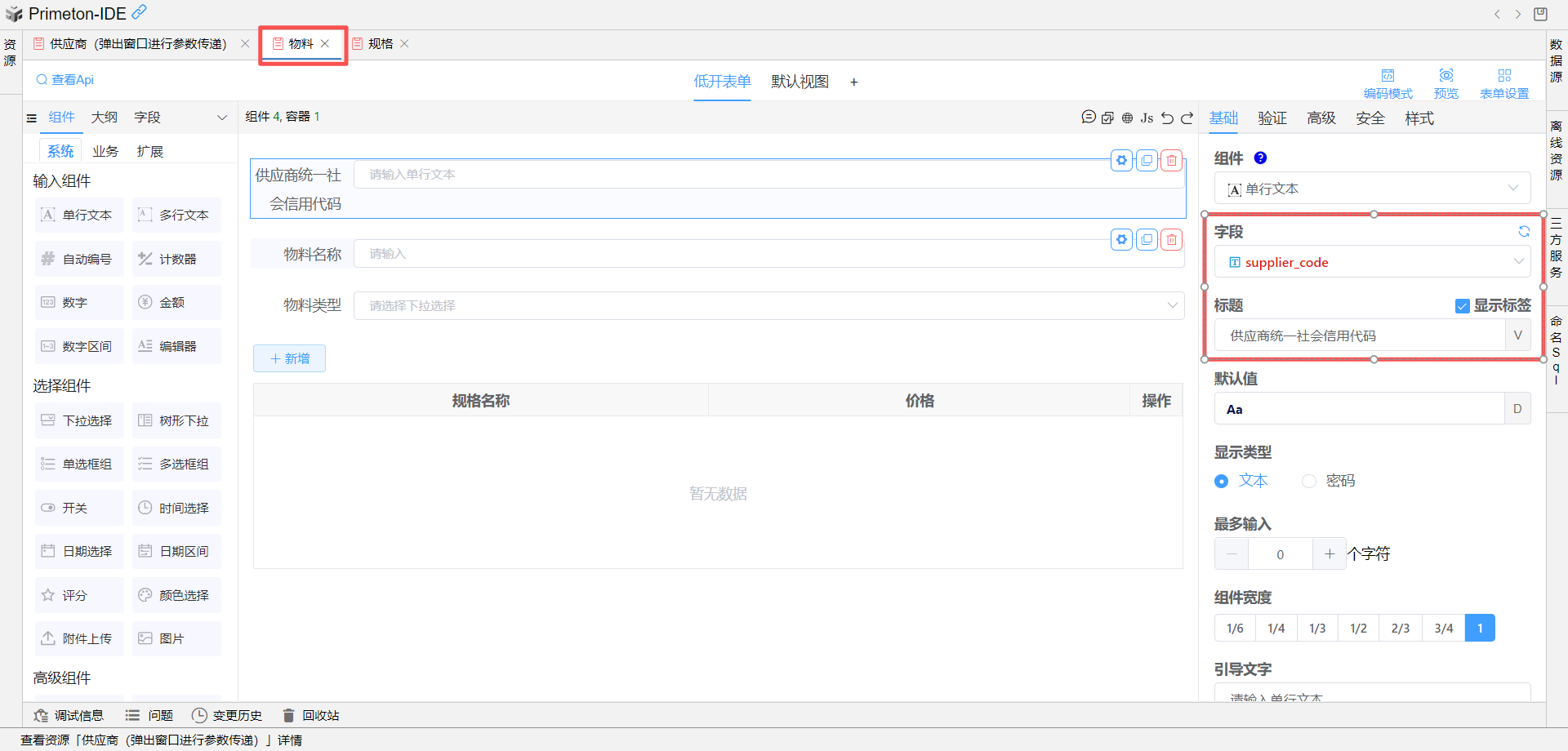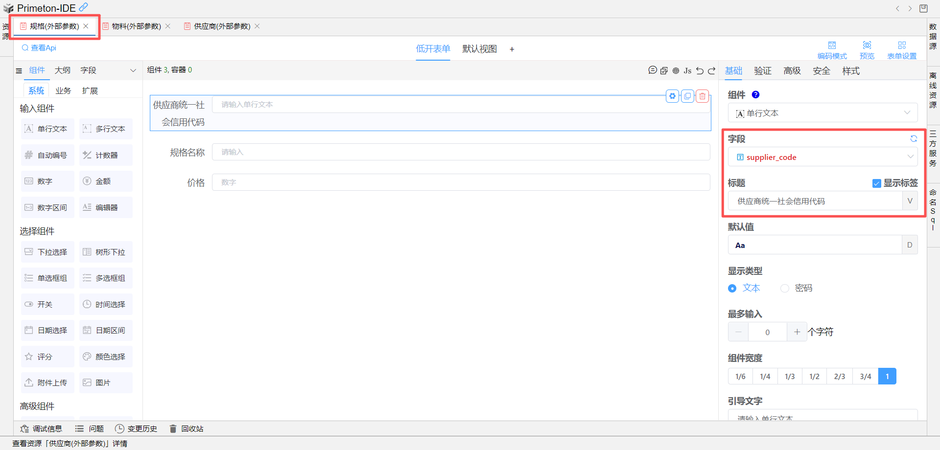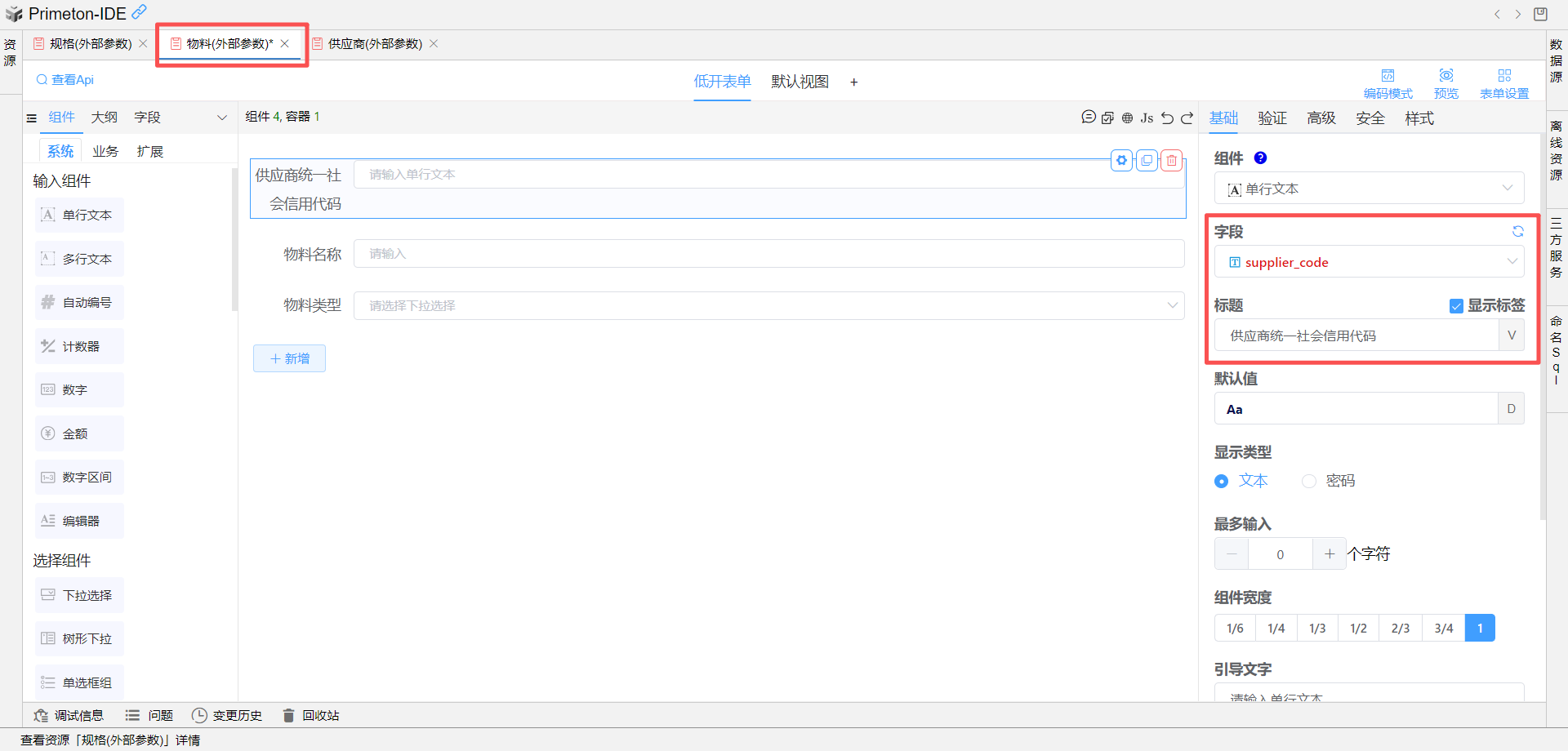 在物料表单中拖入一个单行文本组件,可自定义设置字段标识为