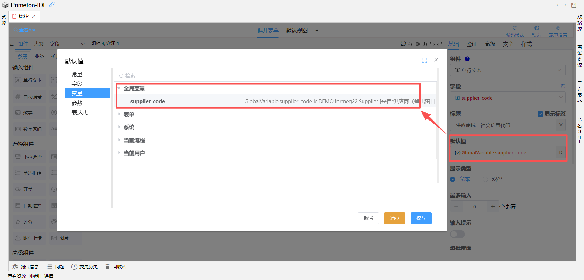 GlobalVariable.supplier_code设置为供应商统一社会信用代码组件的默认值![]()