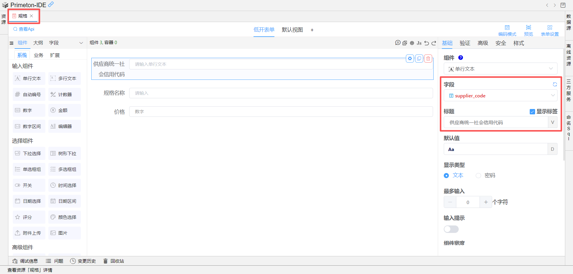 在规格表单中拖入一个单行文本组件,可自定义设置字段标识为