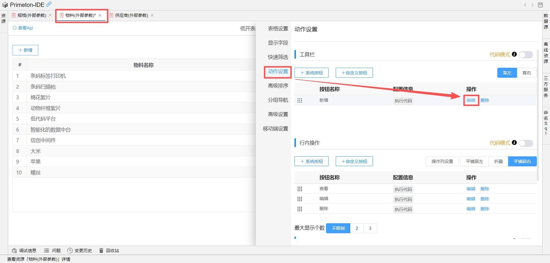 切换到物料默认视图,点击视图设置-动作设置-工具栏-编辑 新增按钮 的配置,在