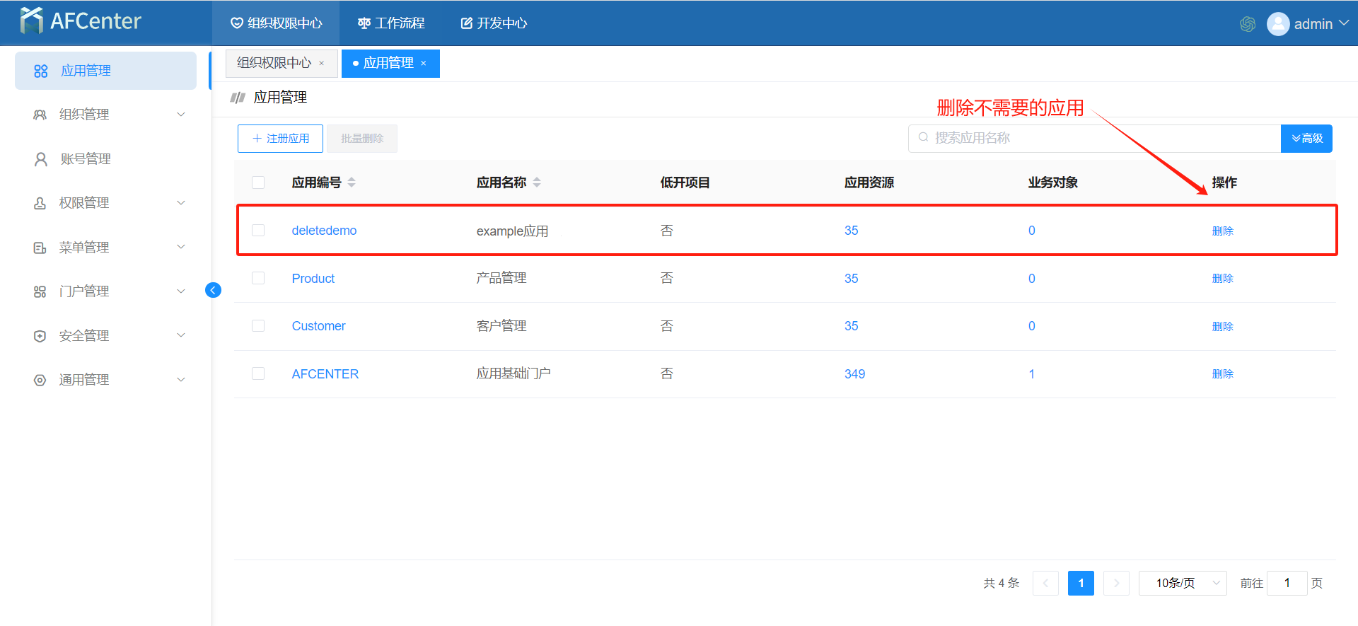 # 删除AFCenter里的业务应用
