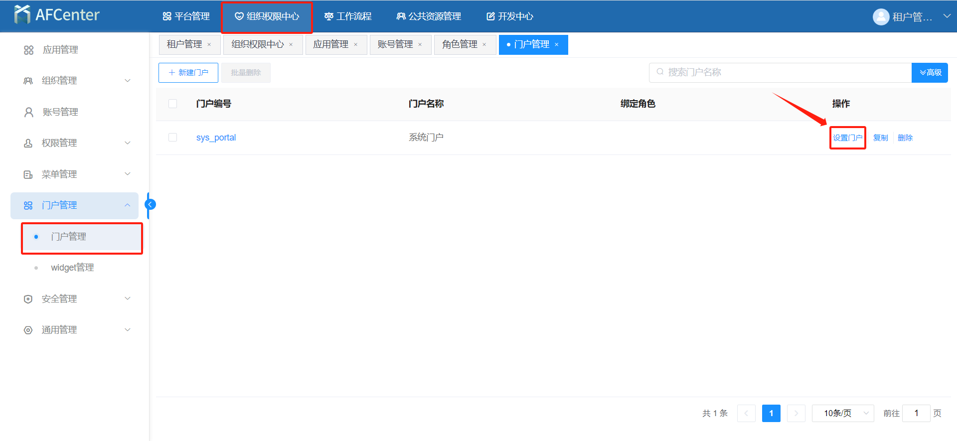 在组织权限中心-门户管理-门户管理,点击任意门户的设置门户。(每个门户中都显示所有应用)