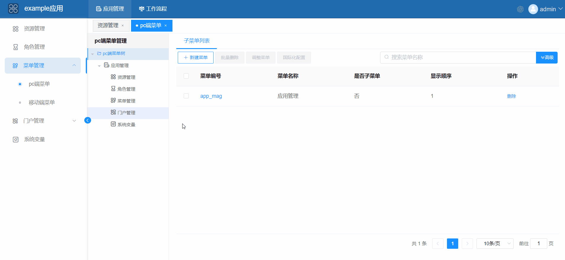 在应用管理页面,点击菜单管理-pc菜单管理,把pc端菜单树下的菜单,按叶子菜单到非叶子菜单全部删除。