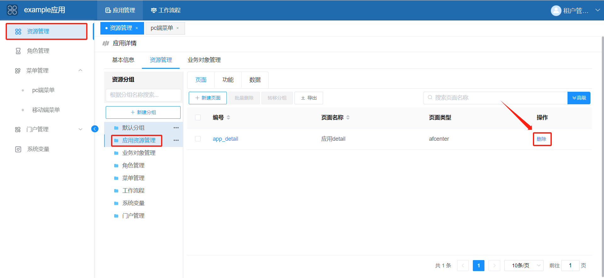 以上一步应用管理-资源管理为例: