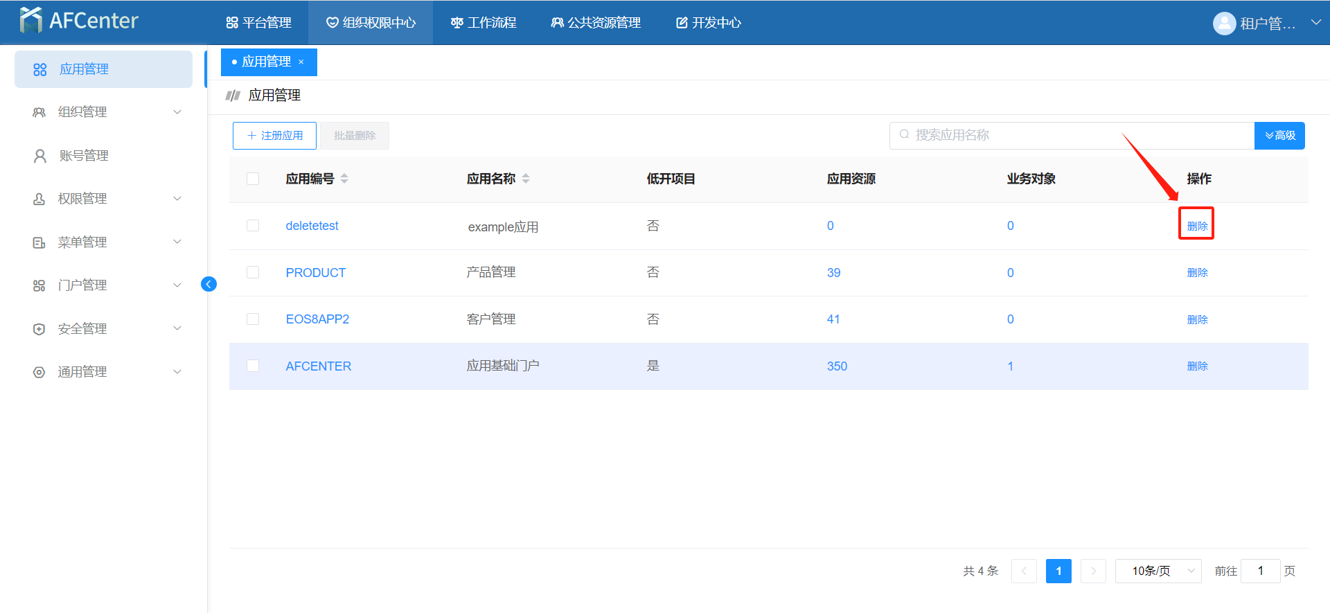 最后在组织权限中心-应用管理中,点击删除应用。