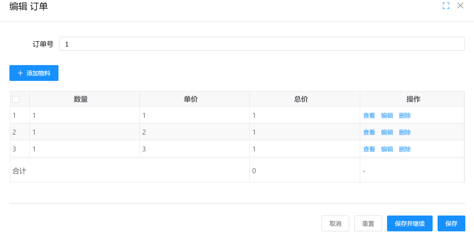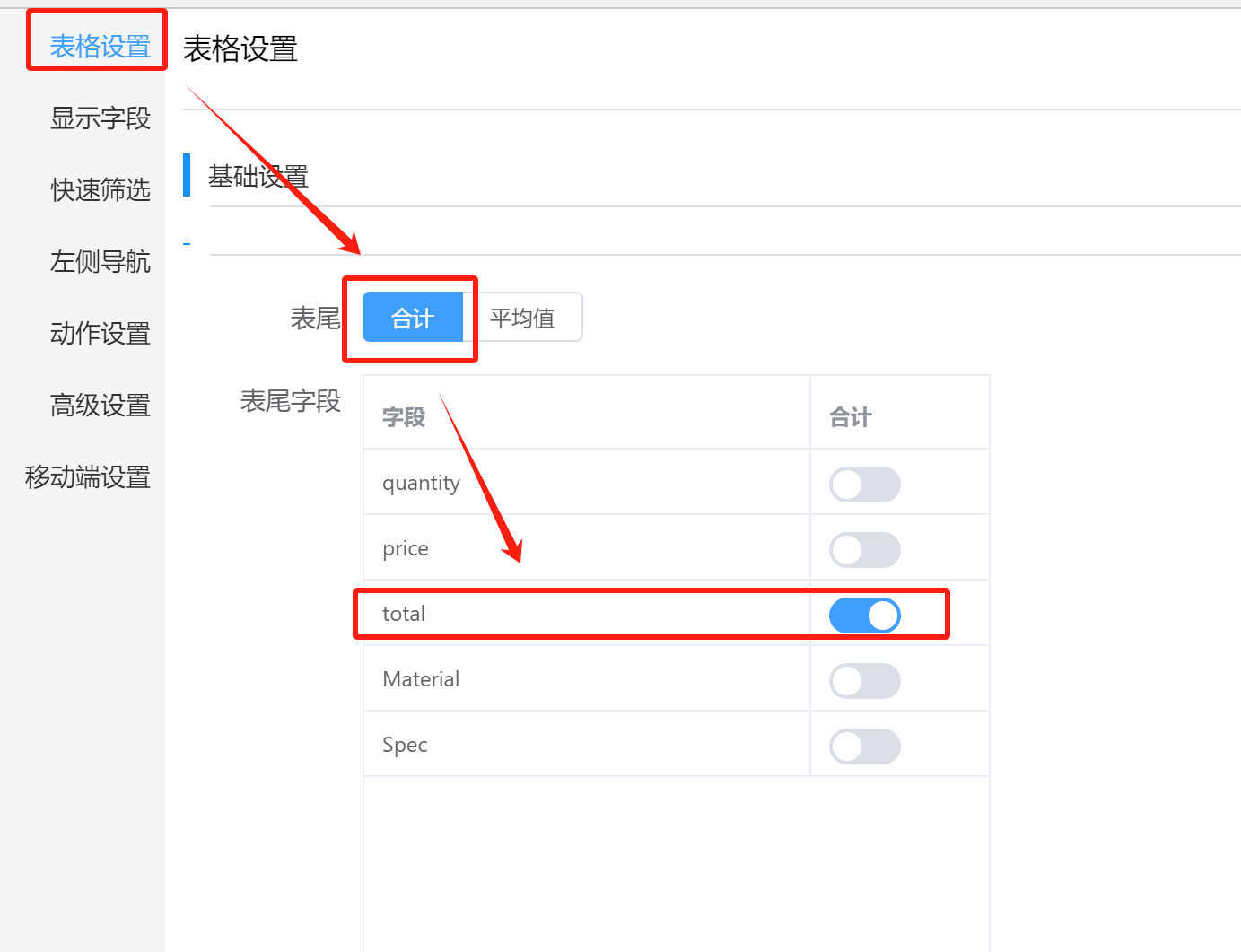 进入订单详情视图,点击表格设置,添加合计,选择字段total。