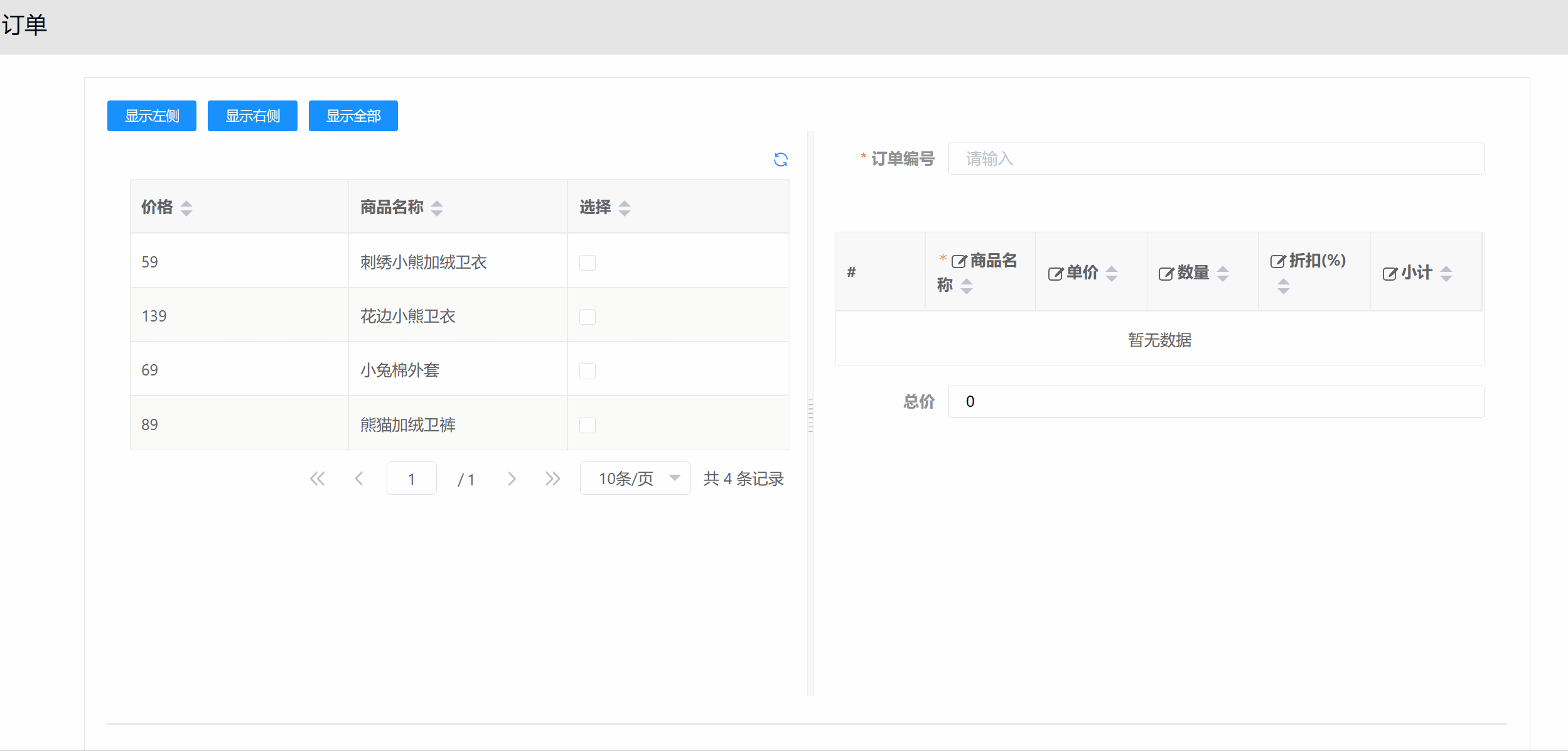 面板分割的的扩展属性onlyShow可以控制面板显示区域。当onlyShow的值为left时只显示左侧,为right时只显示右侧,为null时显示全部。通过控制onlyShow的值即可改变显示区域。