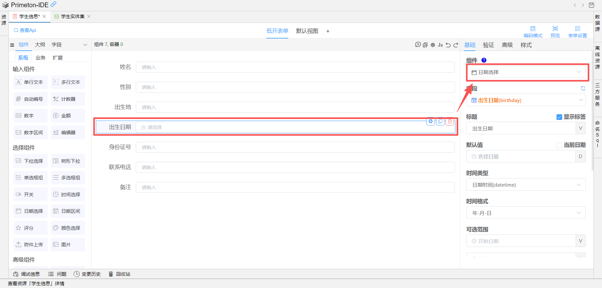 右键点击刚创建的 "学生" 实体,点击生成表单,将出生日期的组件类型改为 "日期选择" 组件