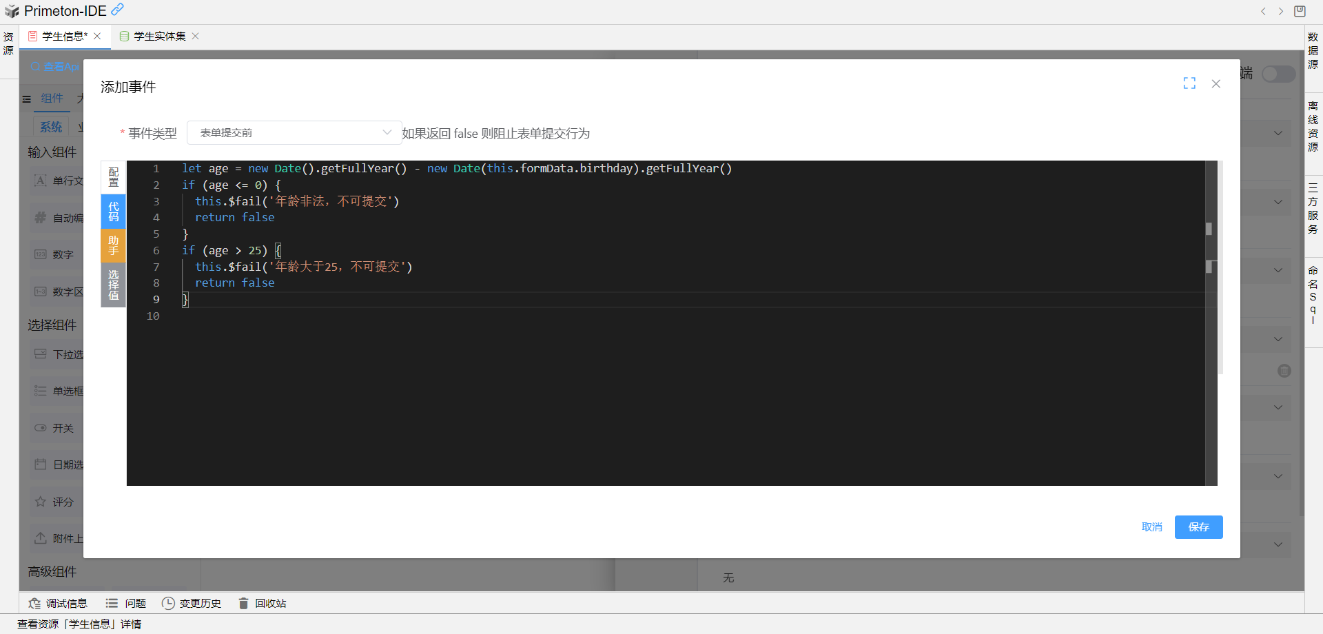 使用场景:"学生" 表单在提交前校验填写人年龄是否大于0岁并小于等于25岁,如果年龄不在该范围内,则提示不可提交并取消提交操作。