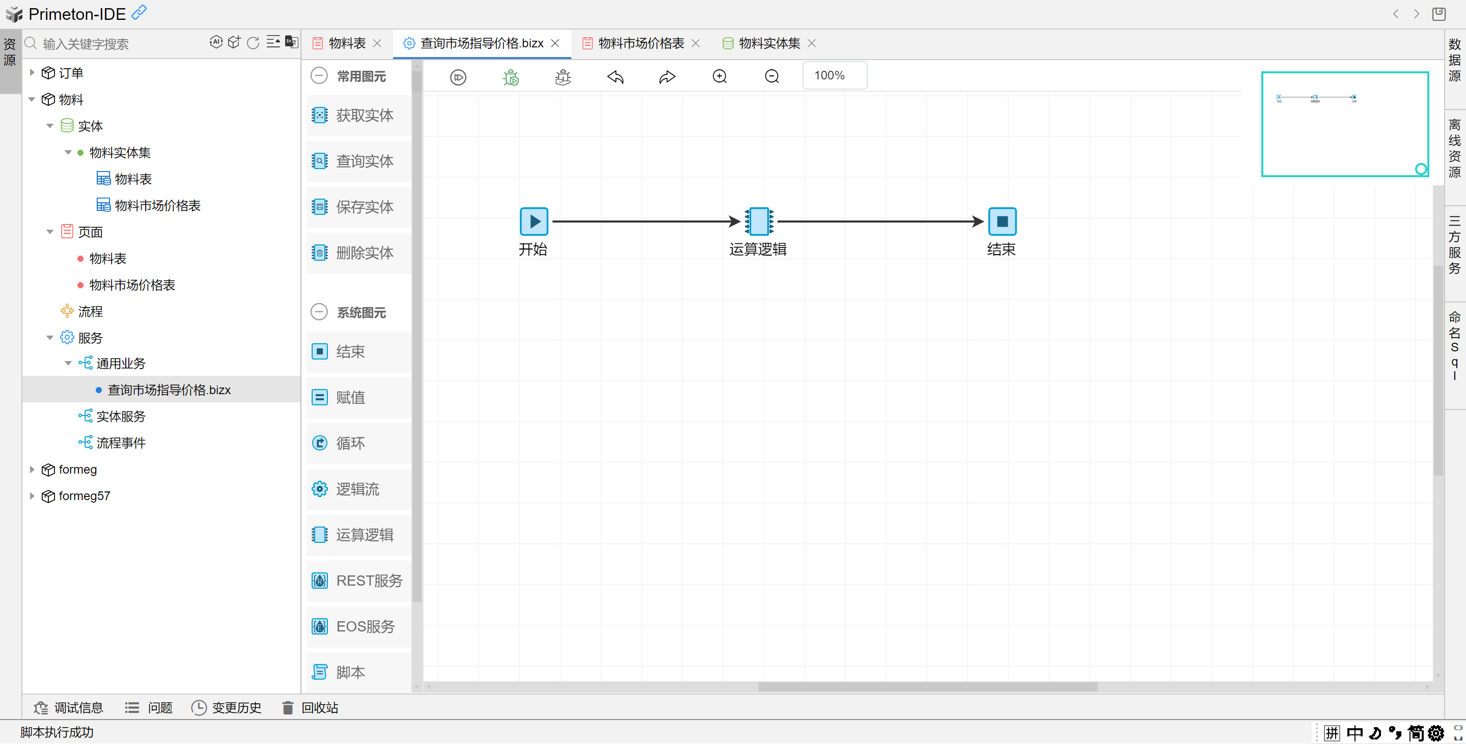 在服务-通用业务中新建服务,通过queryEntitiesByProperty获取物料市场指导价格: