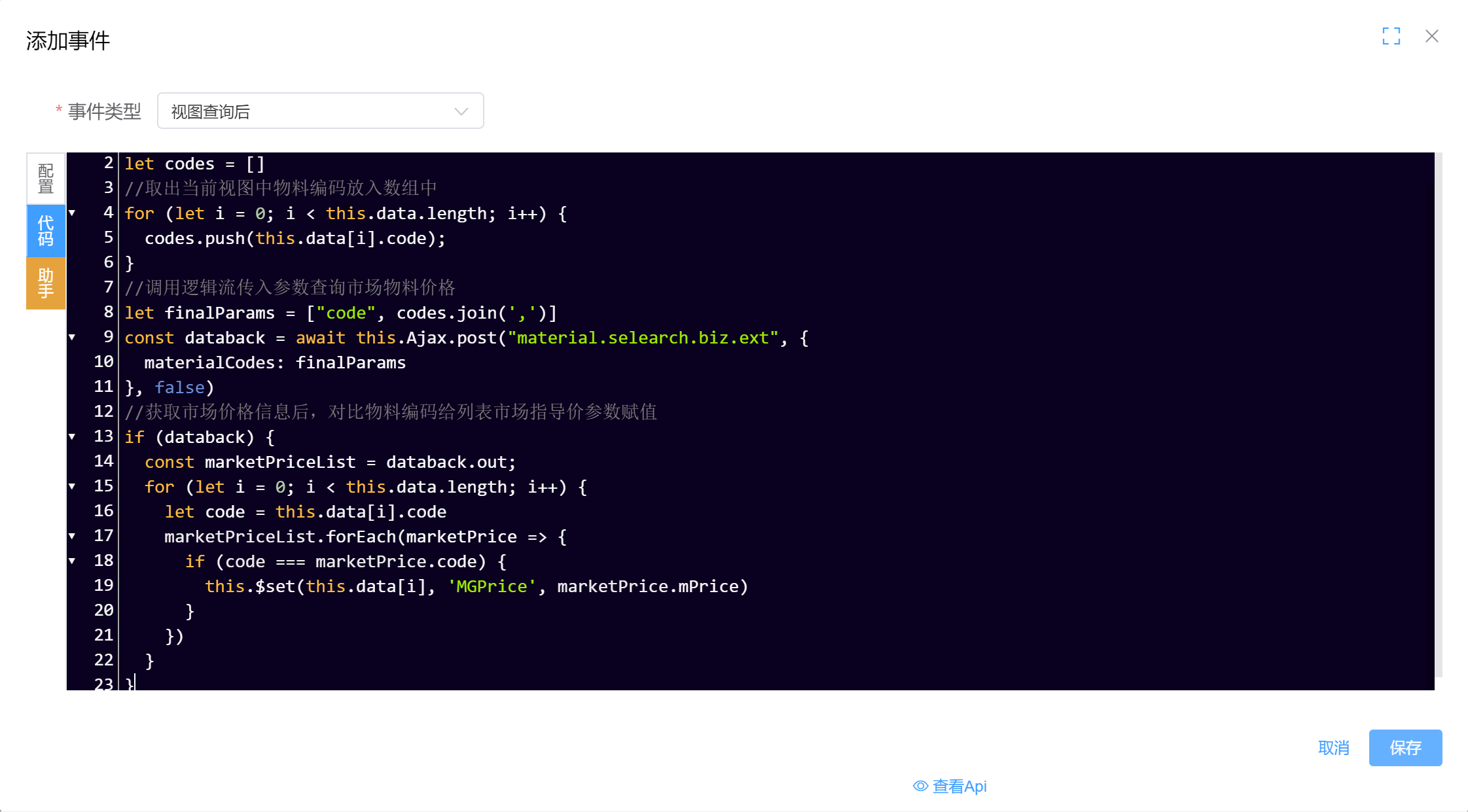 2.添加视图查询后事件,从物料表中获取物料编码,查询物料编码对应的市场指导价格,再将查询到的市场指导价格更新回相应的物料表中,以便后续展示。