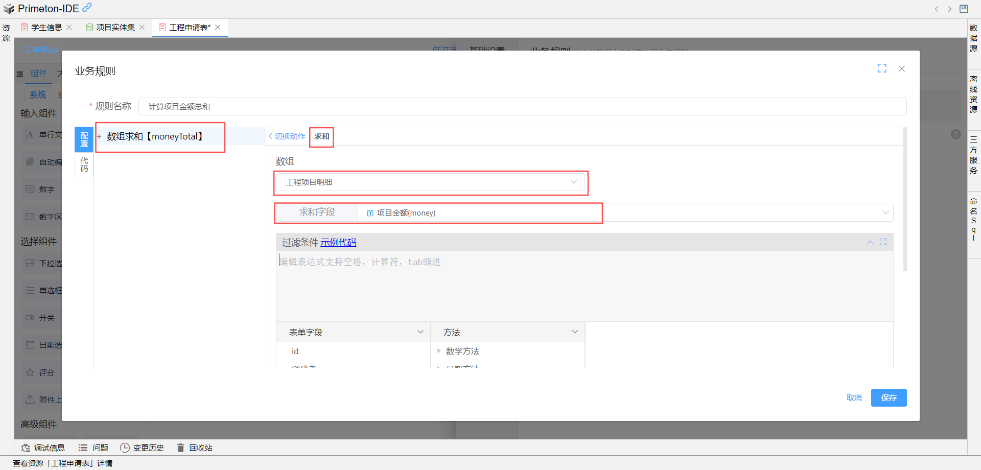 使用场景:工程表与工程项目表为1:n持久化实体模型关系,工程表表单中通过自定义按钮点击后新增工程项目表中的数据行,工程表中项目申报总金额会自动根据子表格中填写的每一个项目金额进行汇总显示出来。