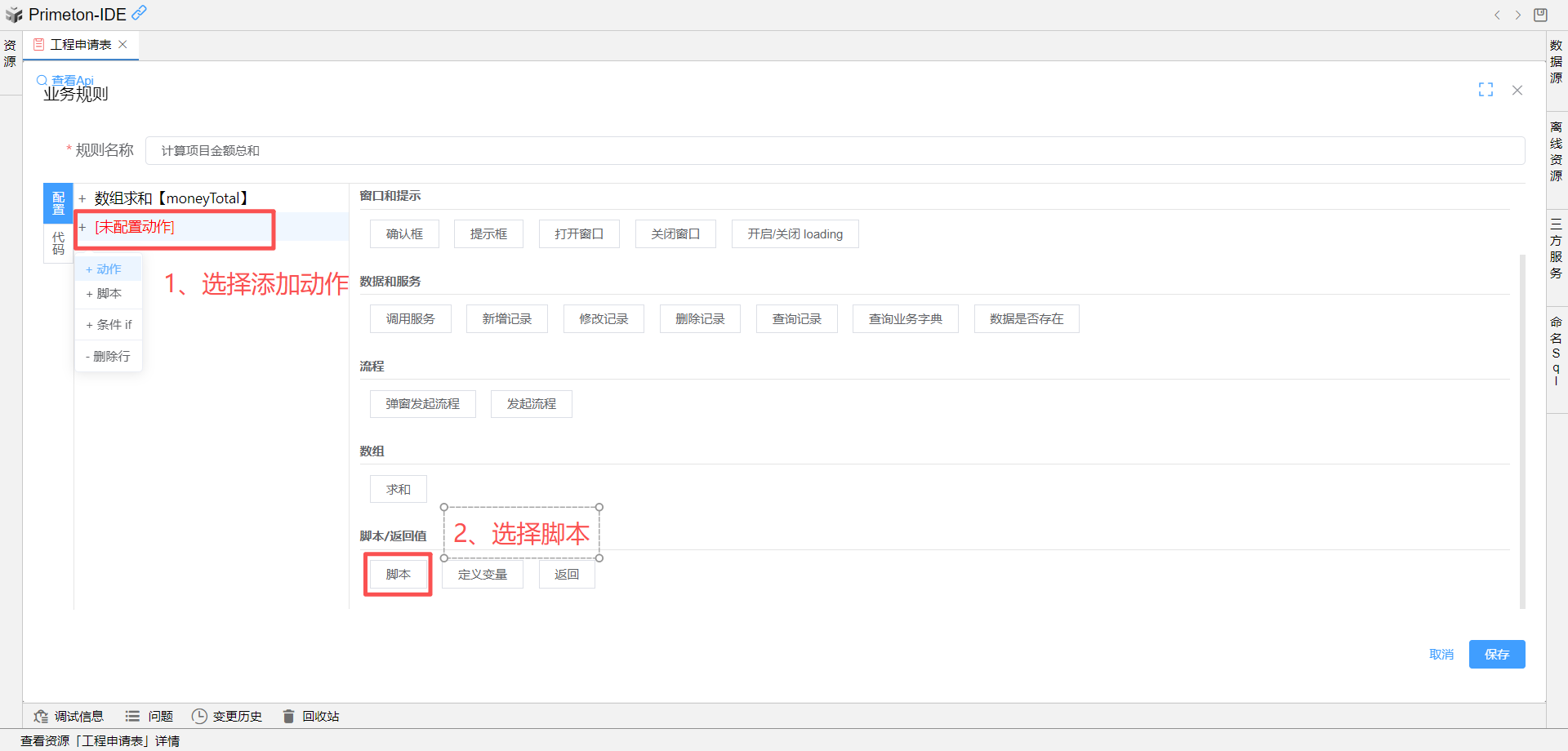 3.1. 在配置页面,选择 “添加动作”,配置求和动作,数组为被求和的子表格(工程项目明细),求和字段为项目金额